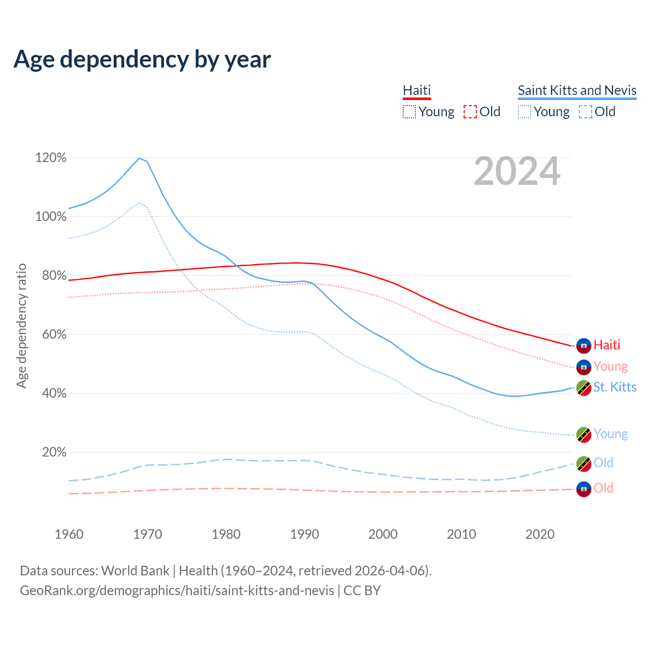 - Haiti is ranked 135/196 by median age (oldest to youngest) vs 69/196 for Saint Kitts and Nevis.