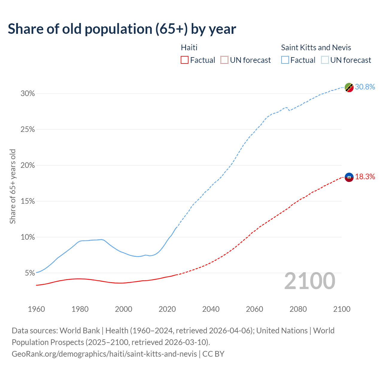 The share of older people aged 65 and over is 4.71% in Haiti and 11.2% in Saint Kitts and Nevis. Life expectancy in Haiti compared to Saint Kitts and Nevis .