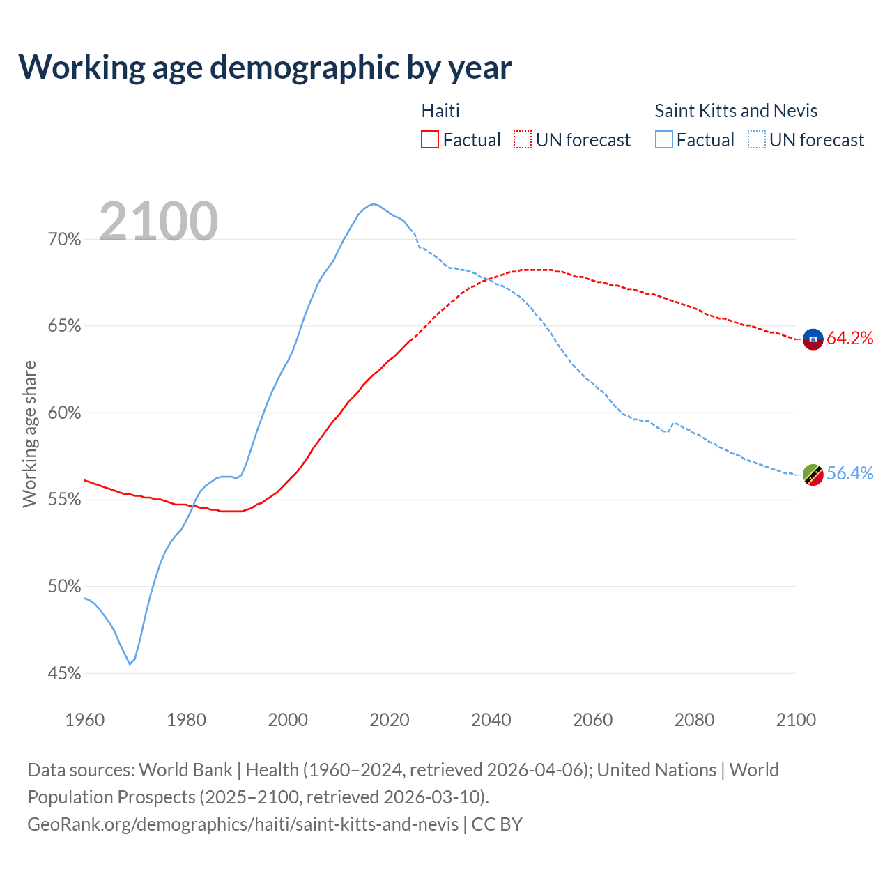 - Haiti has 7.74M working age adults (aged 15-64) vs 33.2K in Saint Kitts and Nevis.