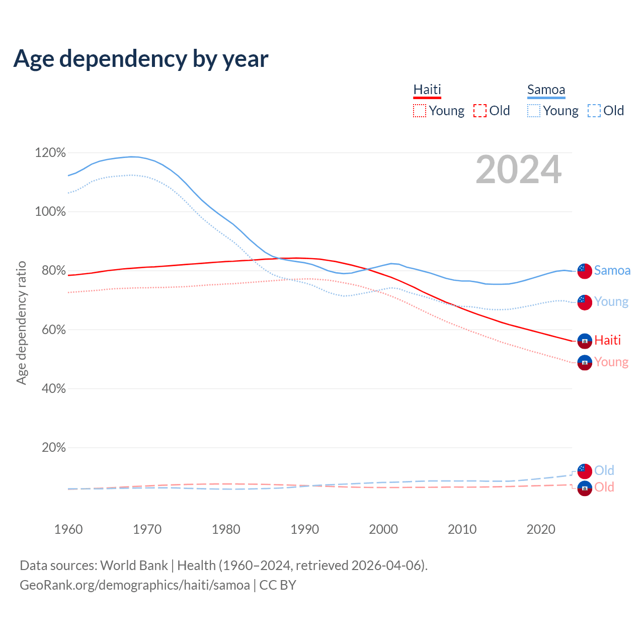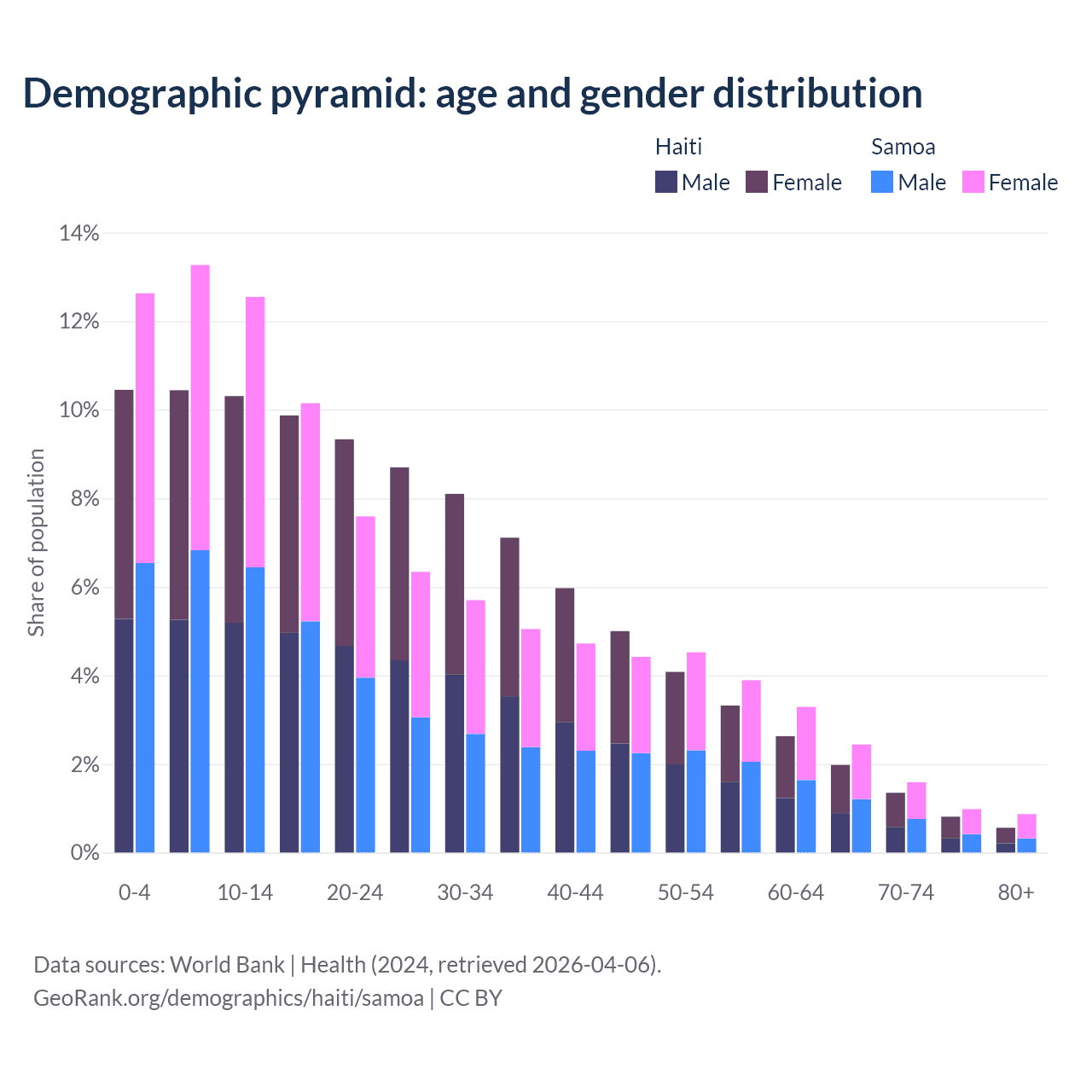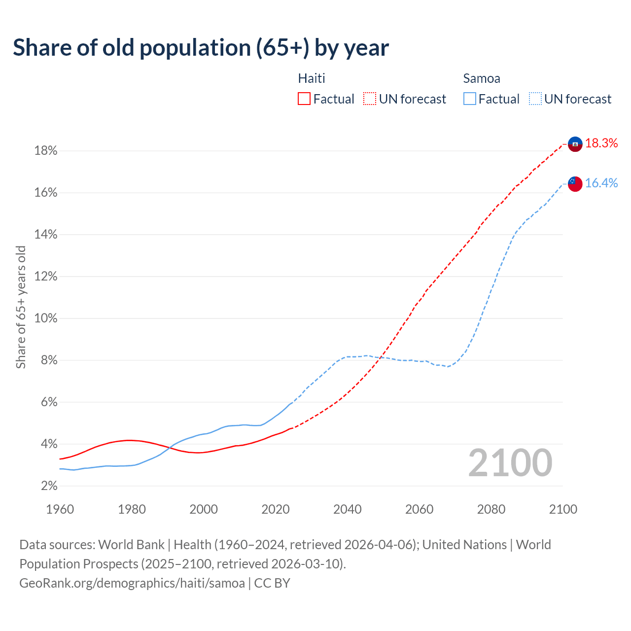- The share of old-age demographic (65+) in Haiti is 4.71% vs 5.88% in Samoa.