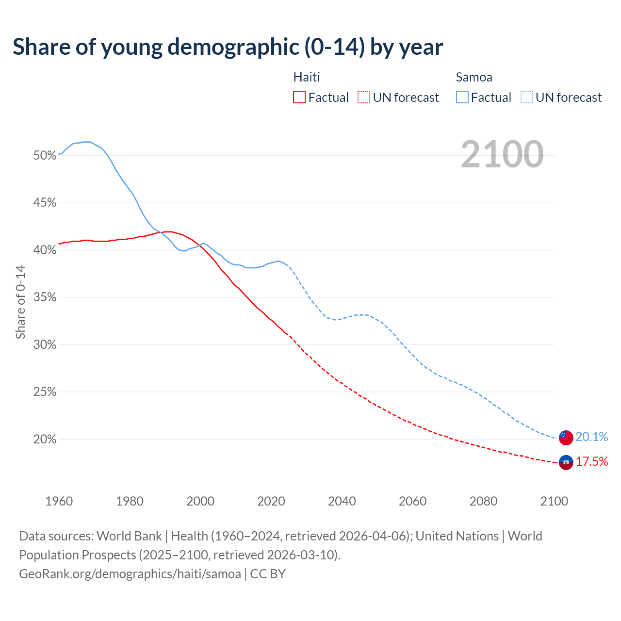 - The share of young demographic (0-15 years old) in Haiti is 31.2% vs 38.5% in Samoa.