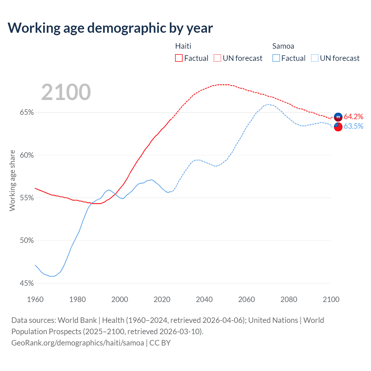 The share of older people aged 65 and over is 4.71% in Haiti and 5.88% in Samoa. Life expectancy in Haiti compared to Samoa .