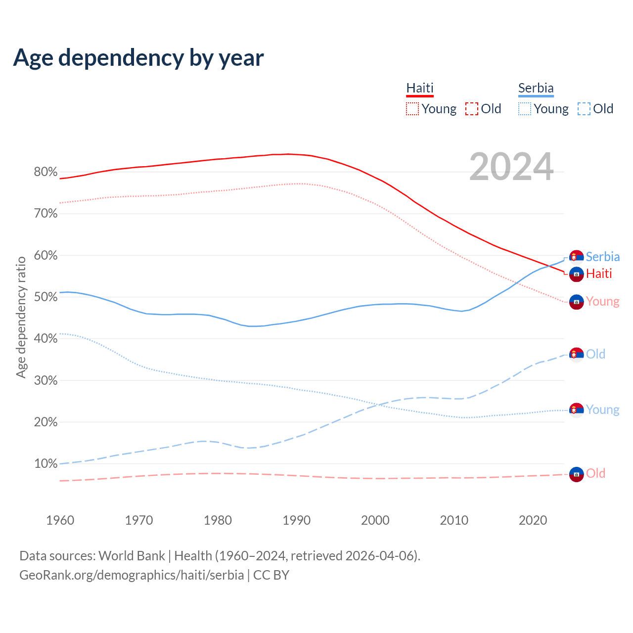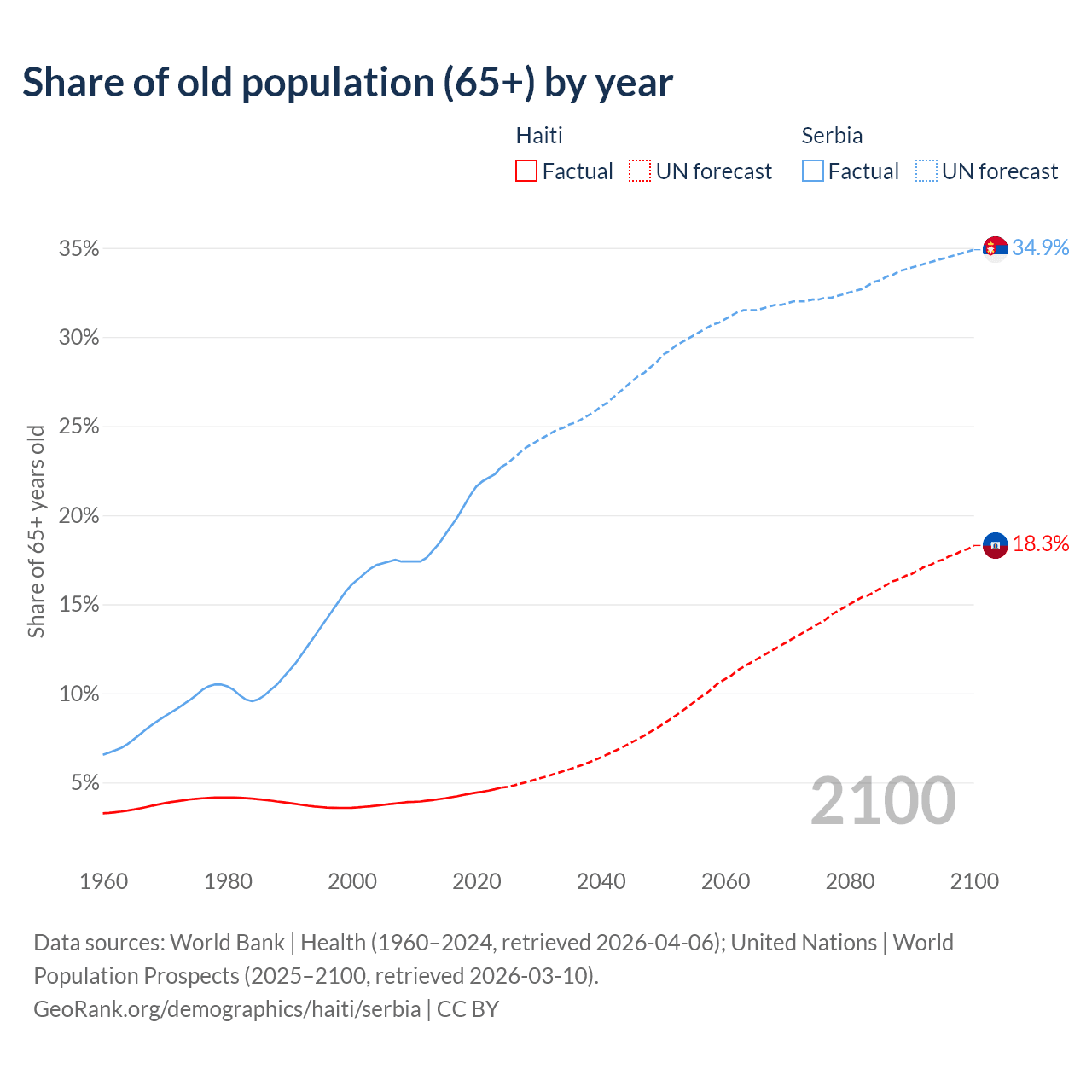 The share of older people aged 65 and over is 4.71% in Haiti and 22.7% in Serbia. Life expectancy in Haiti compared to Serbia .