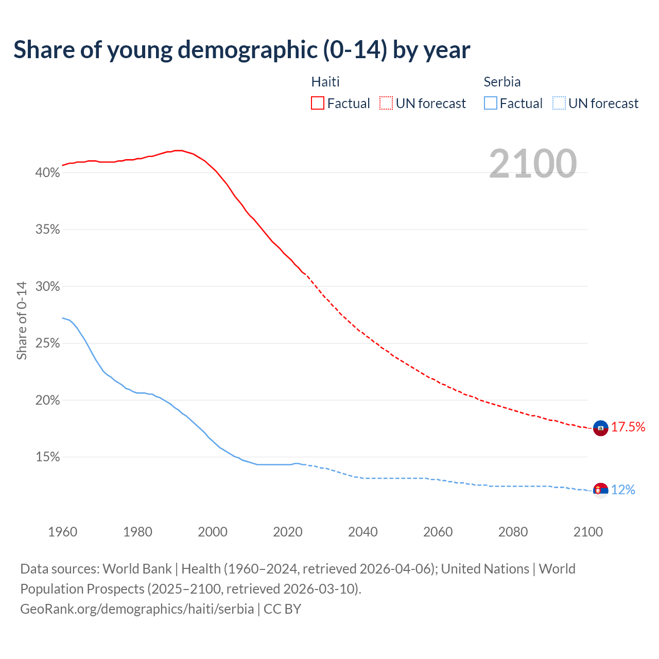 - The share of young demographic (0-15 years old) in Haiti is 31.2% vs 14.3% in Serbia.