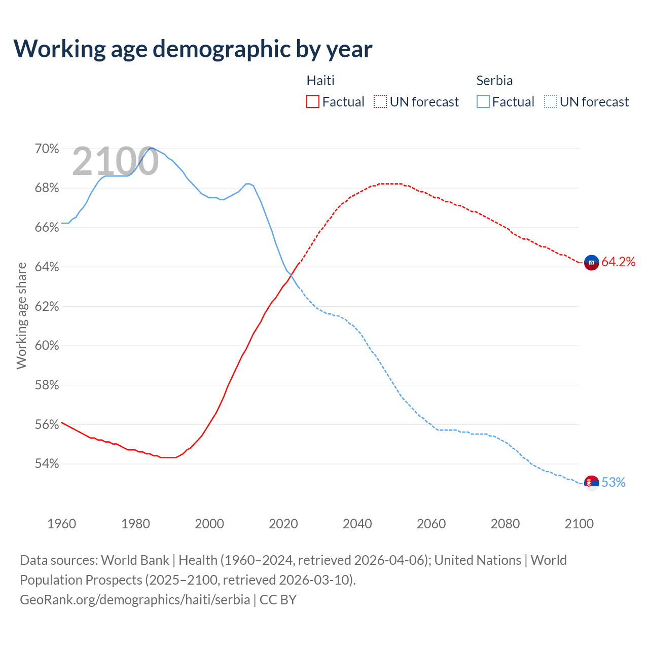Median age Haiti vs Serbia, 1960-2100