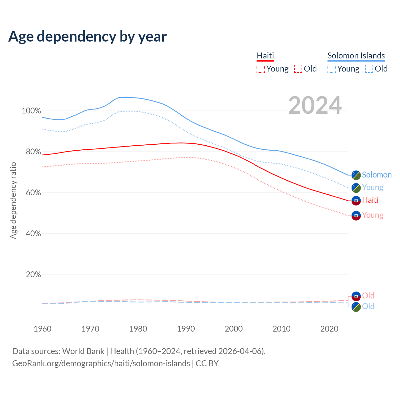 - Haiti is ranked 135/196 by median age (oldest to youngest) vs 153/196 for the Solomon Islands.