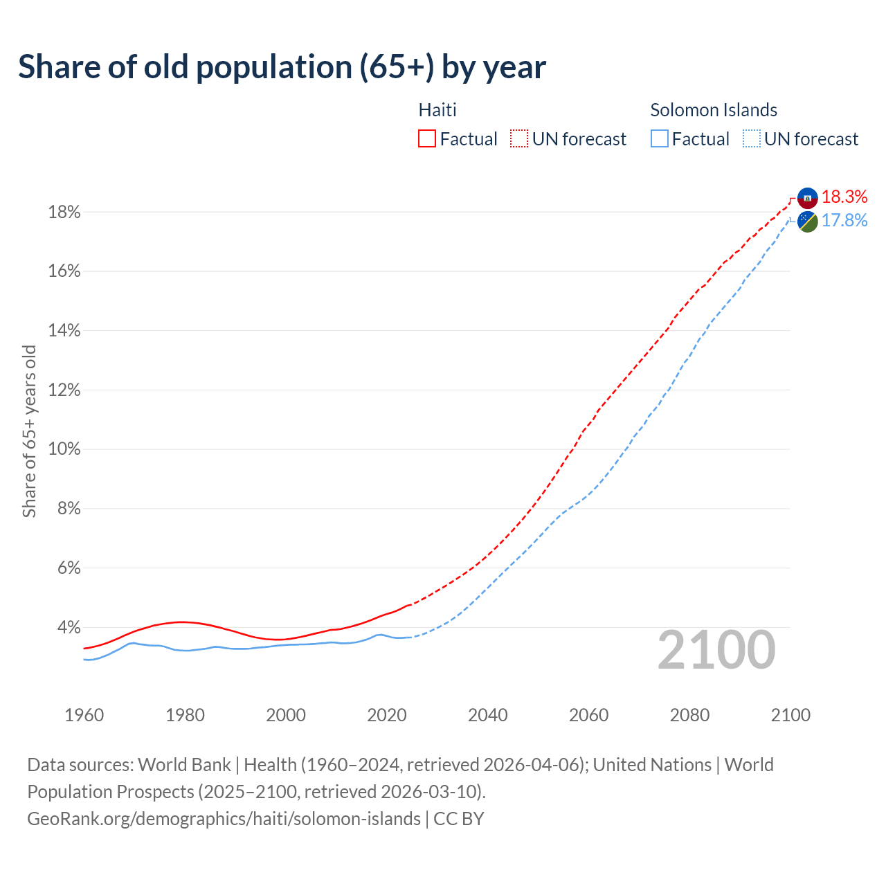 - The share of old-age demographic (65+) in Haiti is 4.71% vs 3.64% in the Solomon Islands.