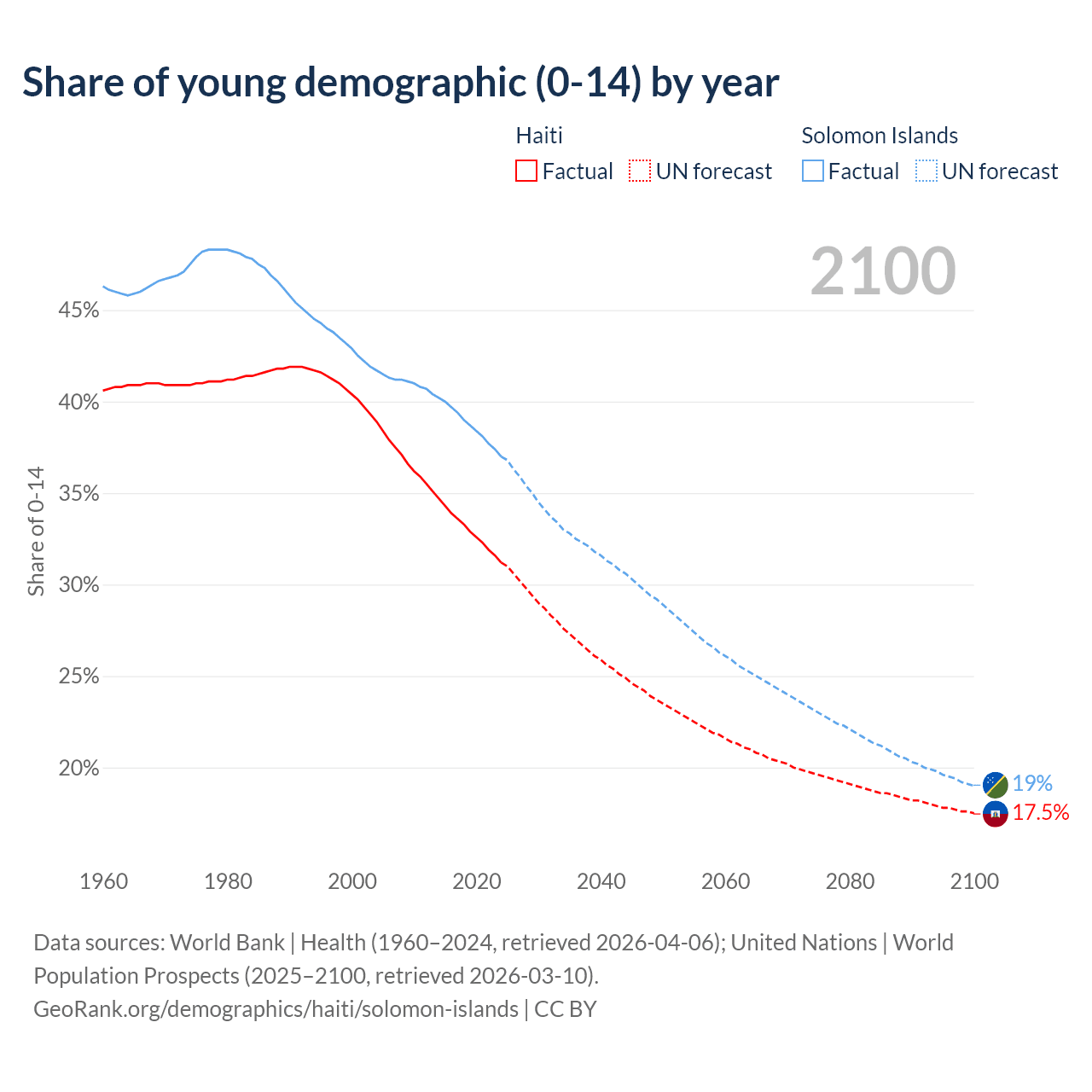 - As of 2026, the population of Haiti is 12.1M vs 864K in the Solomon Islands - 14 times difference.