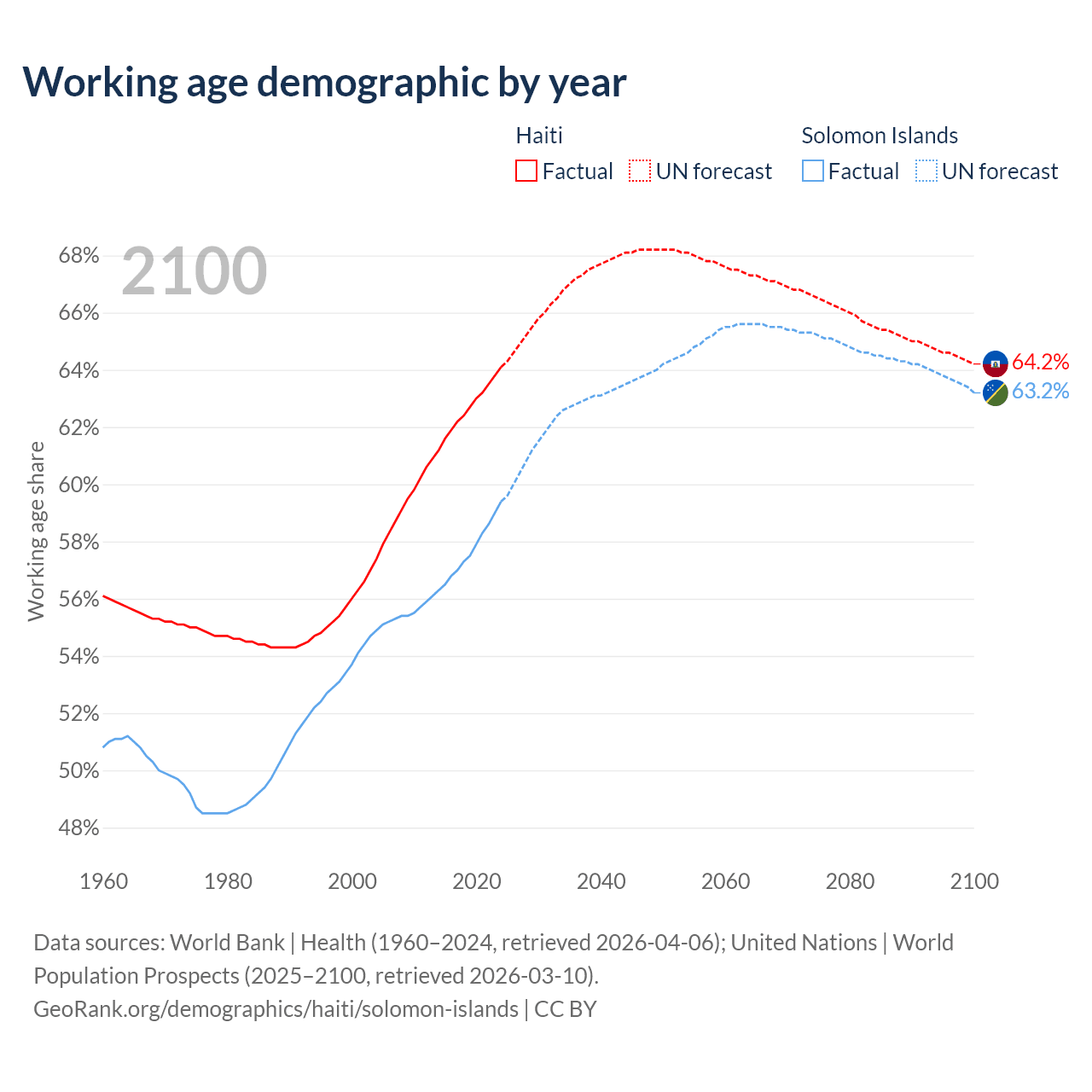 - Haiti has 7.74M working age adults (aged 15-64) vs 513K in the Solomon Islands.