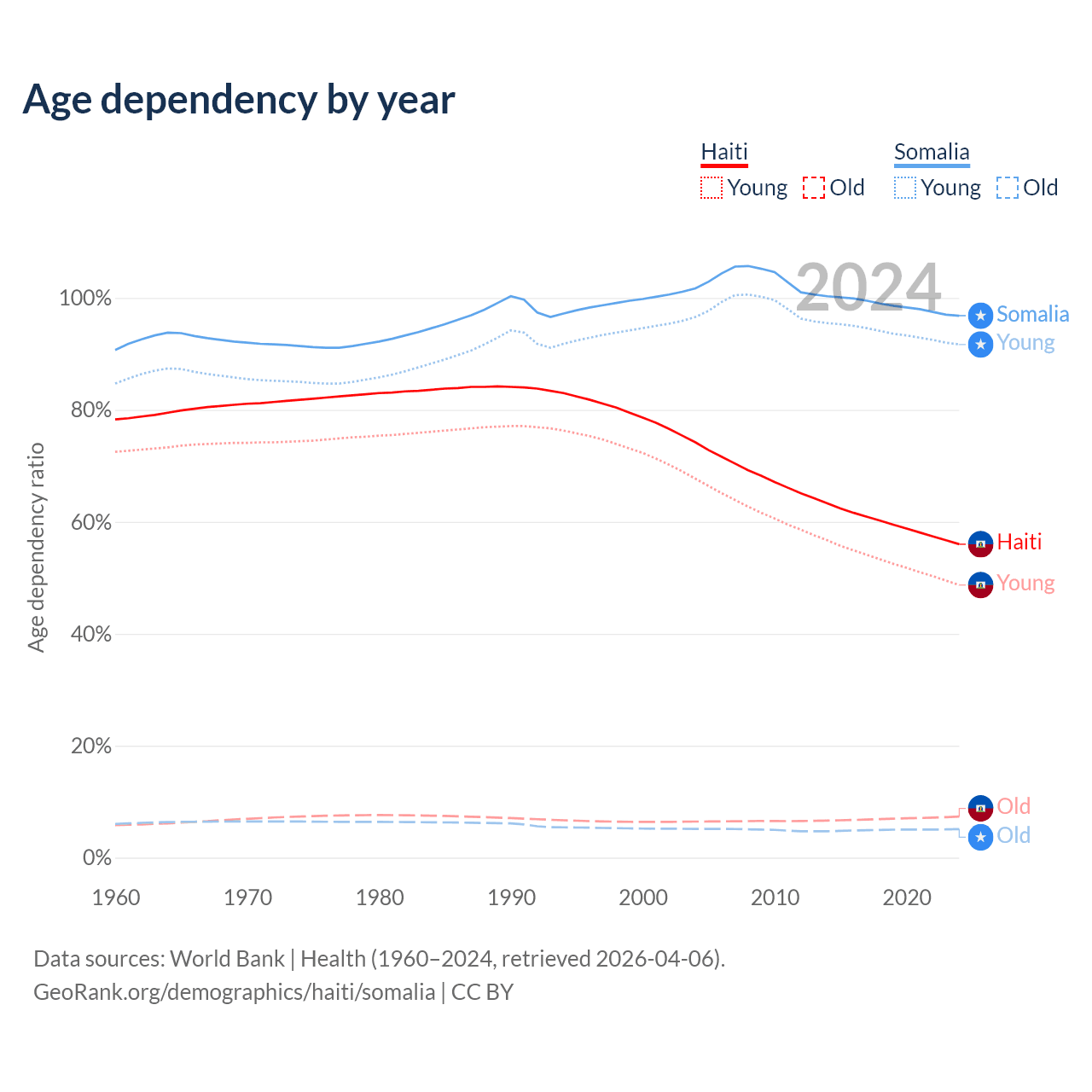 - The share of old-age demographic (65+) in Haiti is 4.71% vs 2.59% in Somalia.