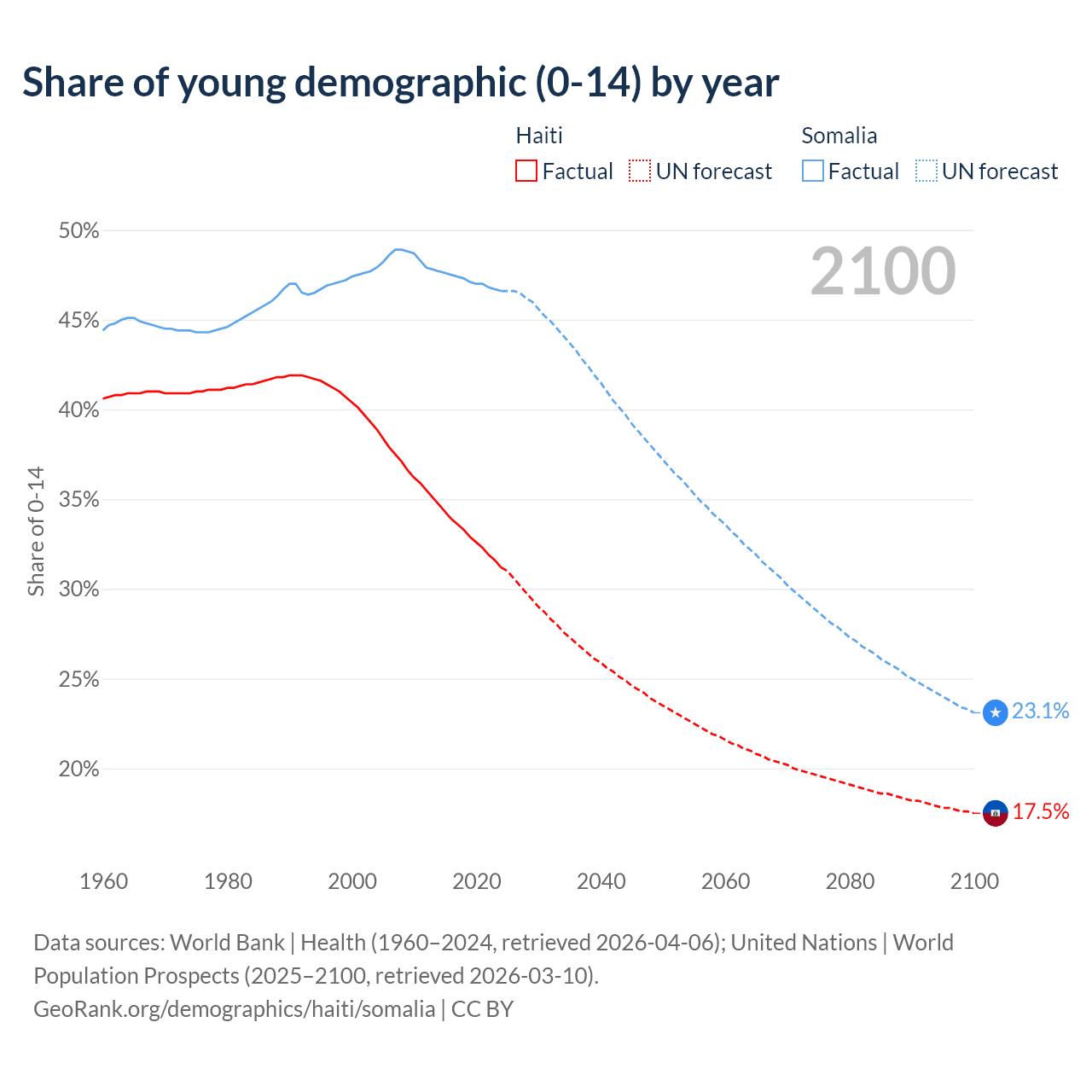 - The share of young demographic (0-15 years old) in Haiti is 31.2% vs 46.6% in Somalia.