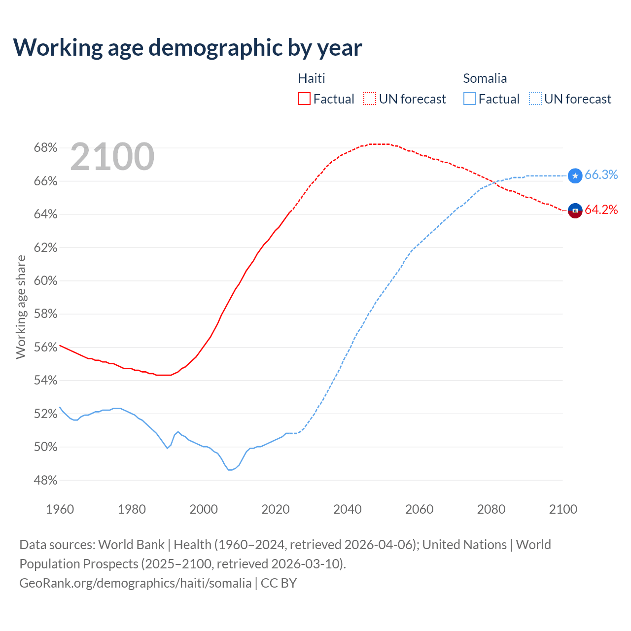 The share of older people aged 65 and over is 4.71% in Haiti and 2.59% in Somalia. Life expectancy in Haiti compared to Somalia .