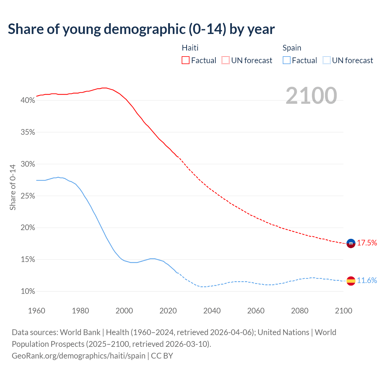 - The share of young demographic (0-15 years old) in Haiti is 31.2% vs 12.9% in Spain.