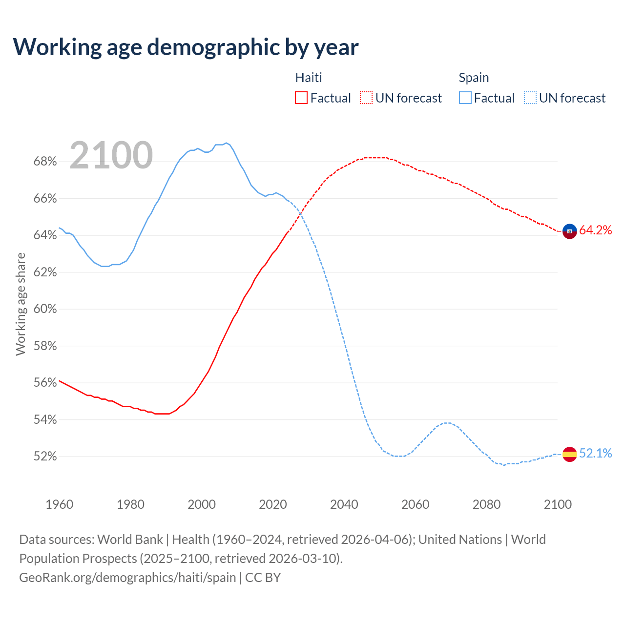 - Haiti has 7.74M working age adults (aged 15-64) vs 32.2M in Spain.
