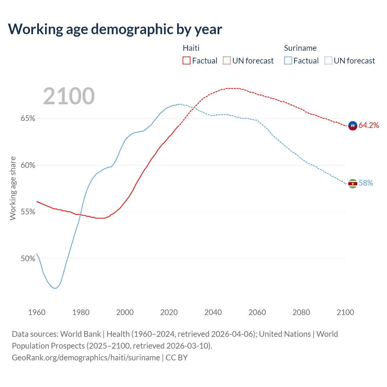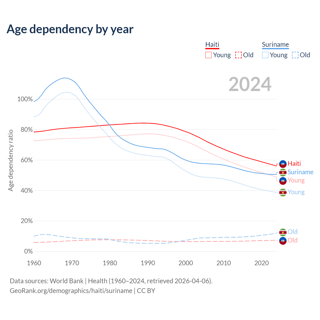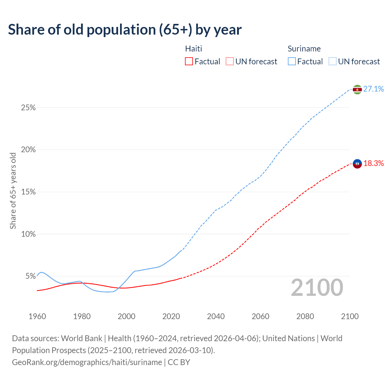 - The share of old-age demographic (65+) in Haiti is 4.71% vs 7.9% in Suriname.