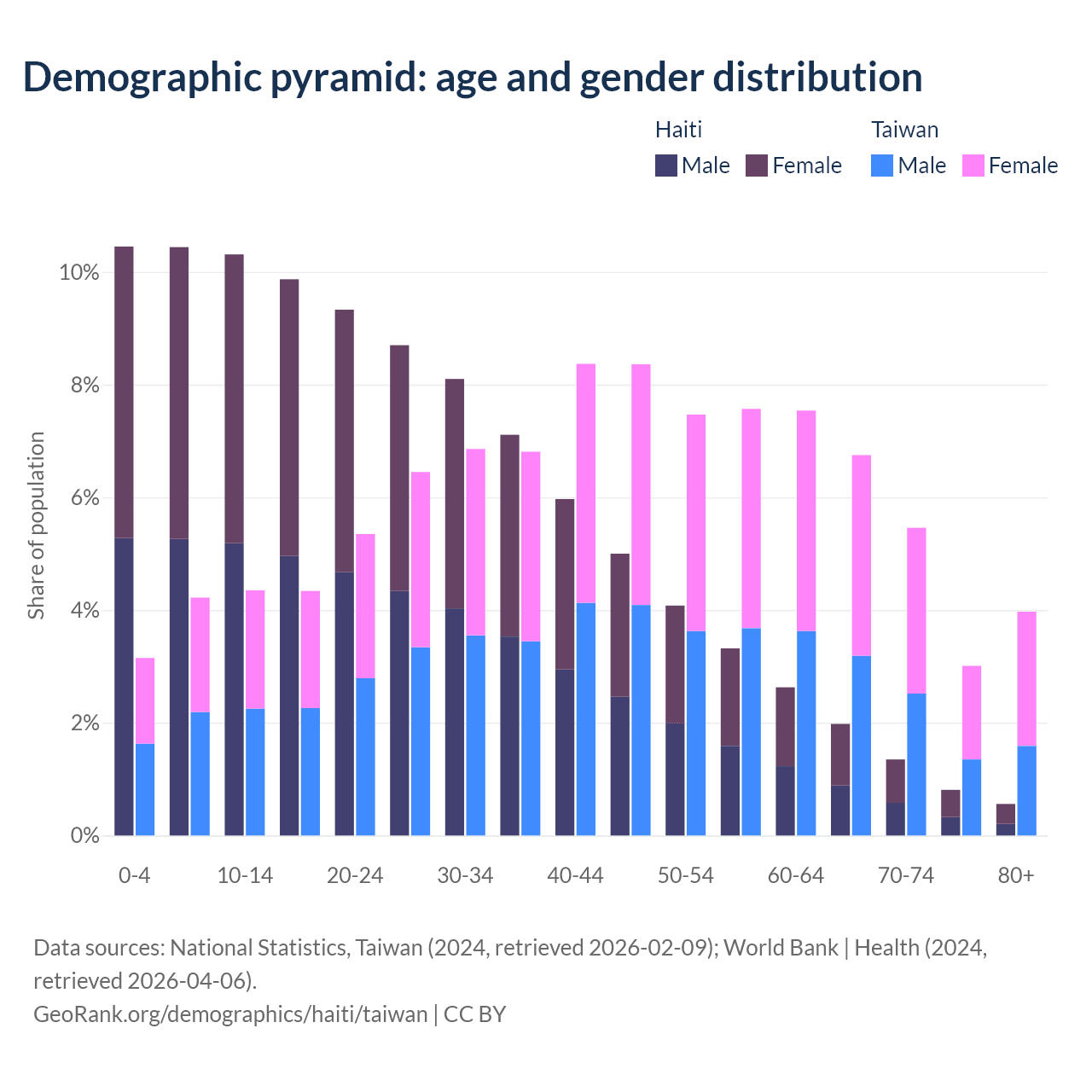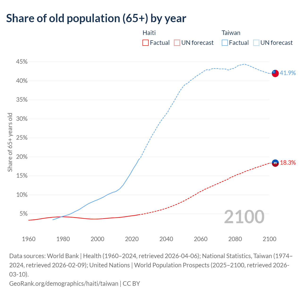 The share of older people aged 65 and over is 4.71% in Haiti and 19.2% in Taiwan. Life expectancy in Haiti compared to Taiwan .