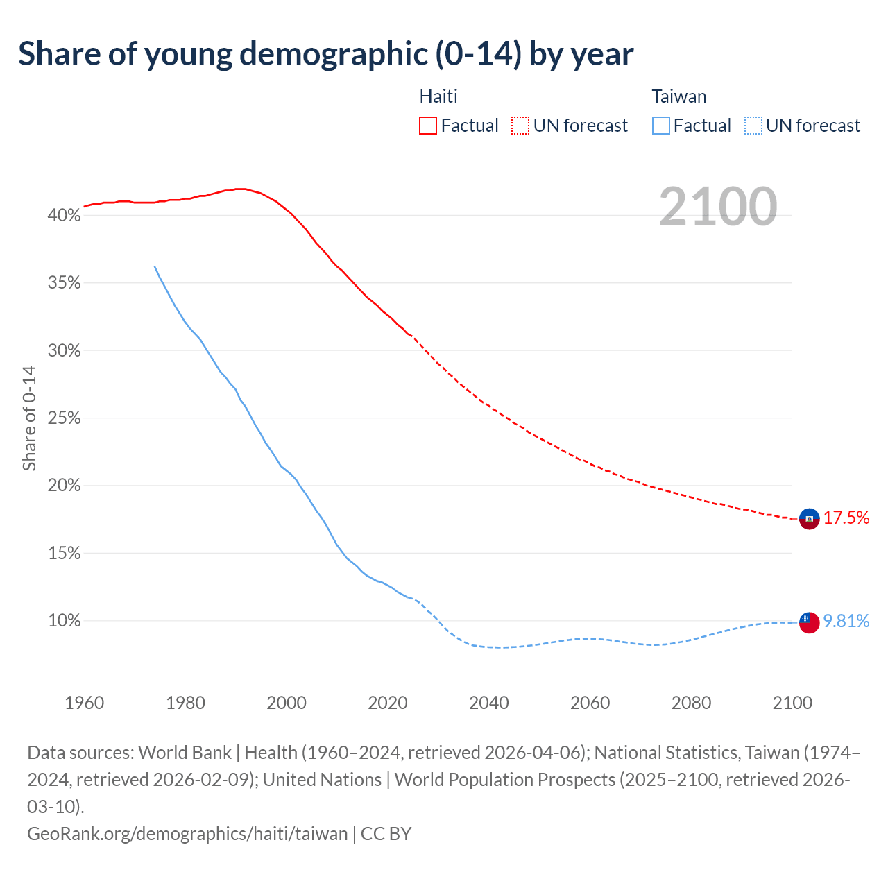- The share of young demographic (0-15 years old) in Haiti is 31.2% vs 11.7% in Taiwan.