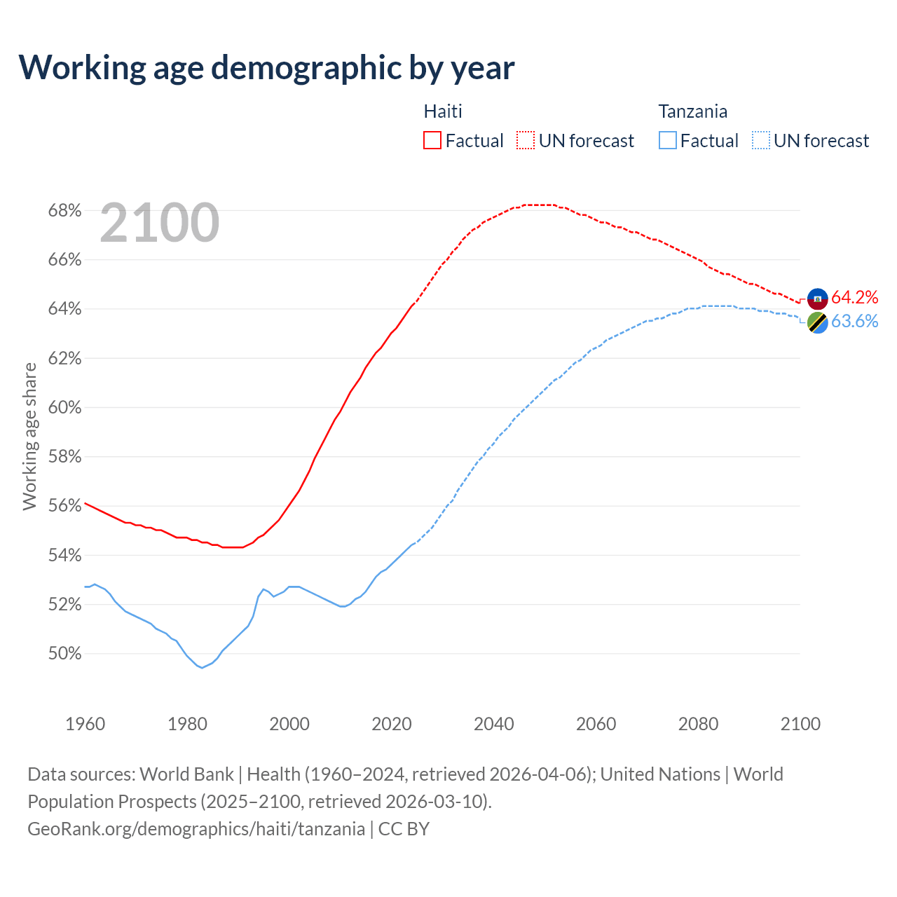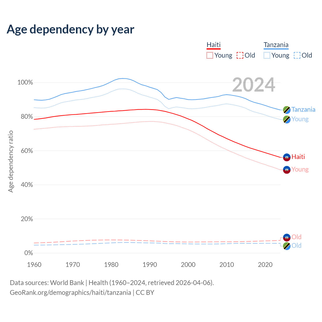 - The share of old-age demographic (65+) in Haiti is 4.71% vs 3.05% in Tanzania.