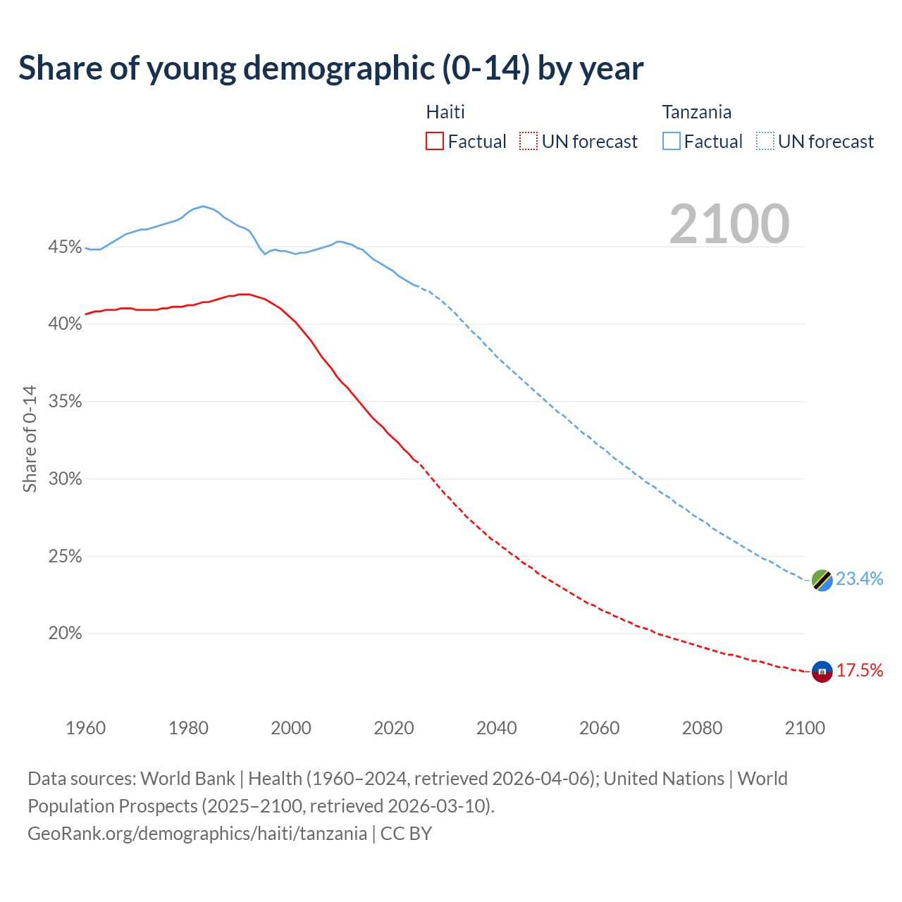 - The share of young demographic (0-15 years old) in Haiti is 31.2% vs 42.5% in Tanzania.