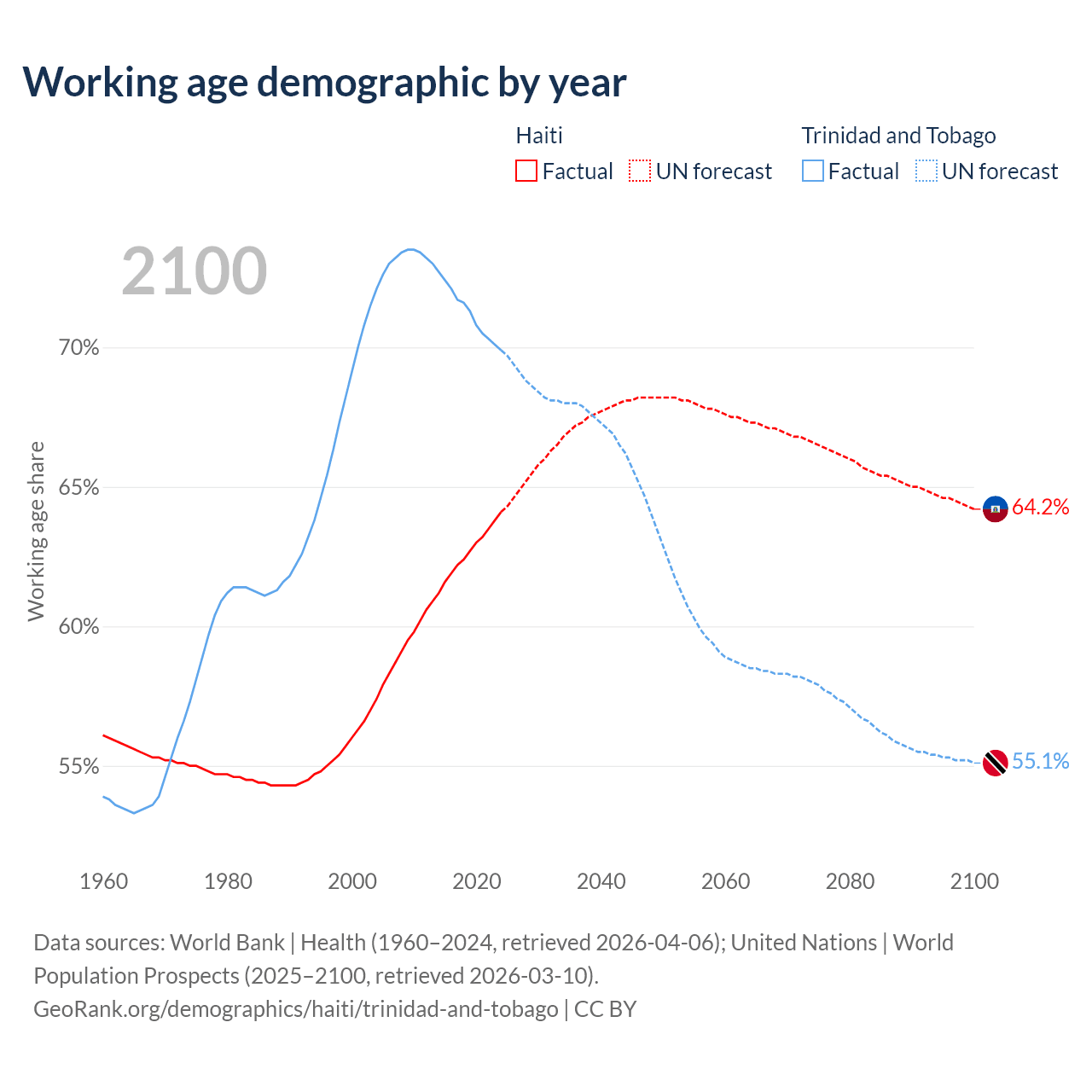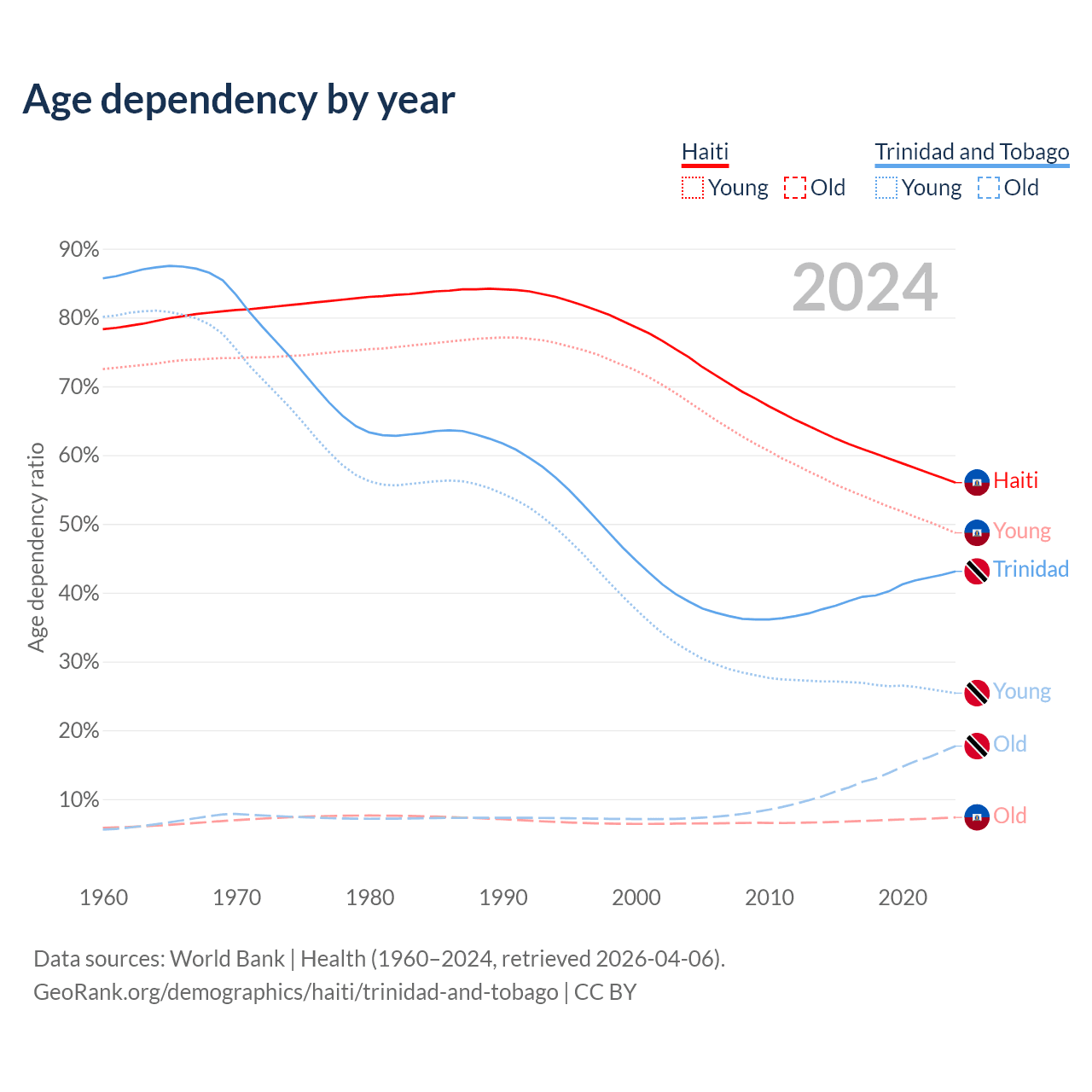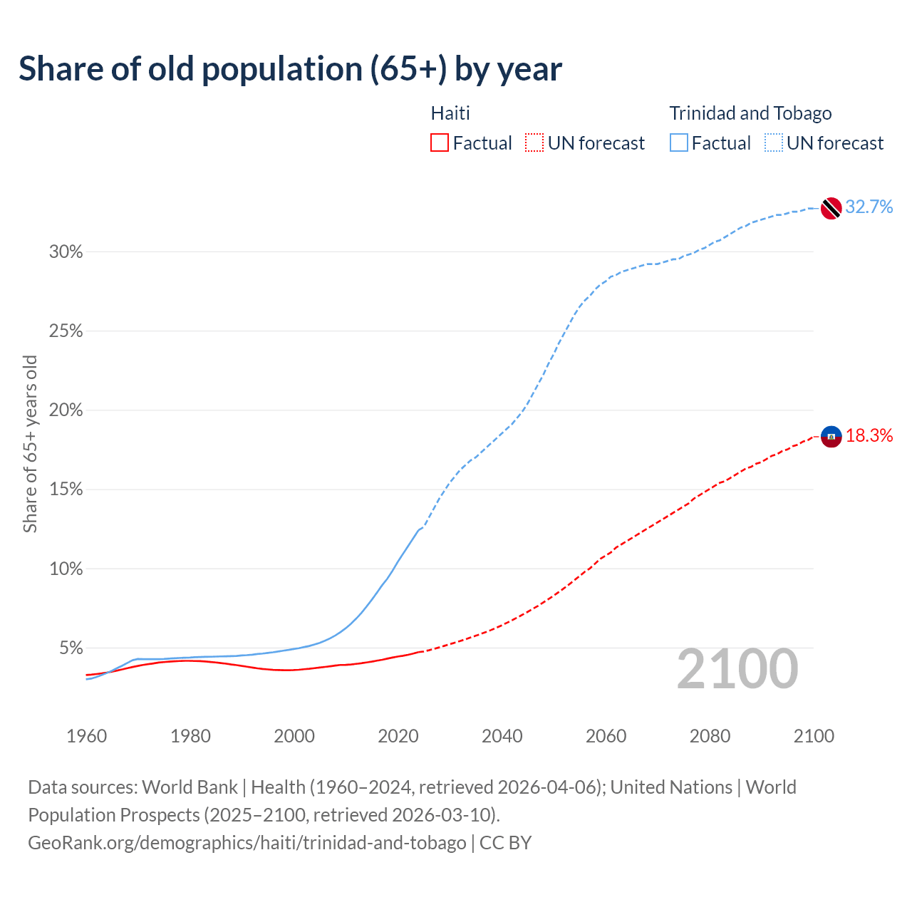 The share of older people aged 65 and over is 4.71% in Haiti and 12.4% in Trinidad and Tobago. Life expectancy in Haiti compared to Trinidad and Tobago .