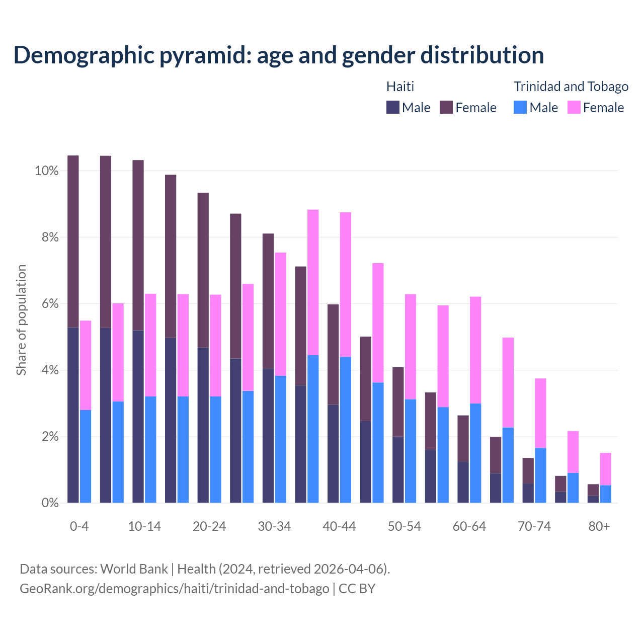 - The share of old-age demographic (65+) in Haiti is 4.71% vs 12.4% in Trinidad and Tobago.