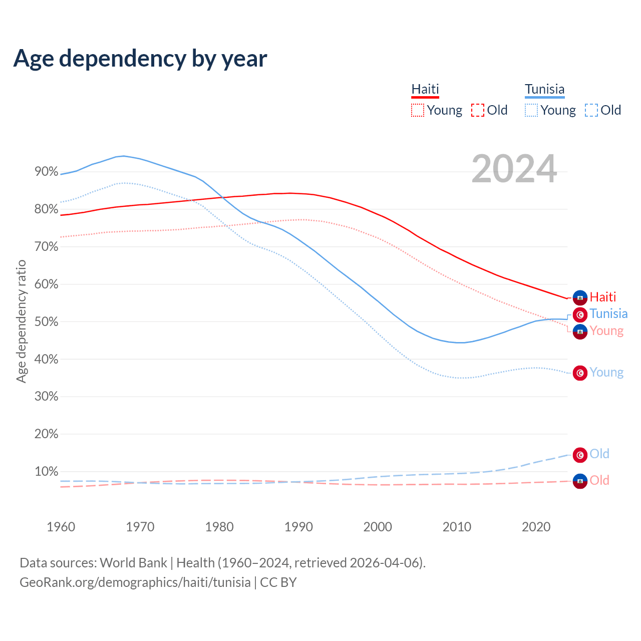 - The share of old-age demographic (65+) in Haiti is 4.71% vs 9.53% in Tunisia.
