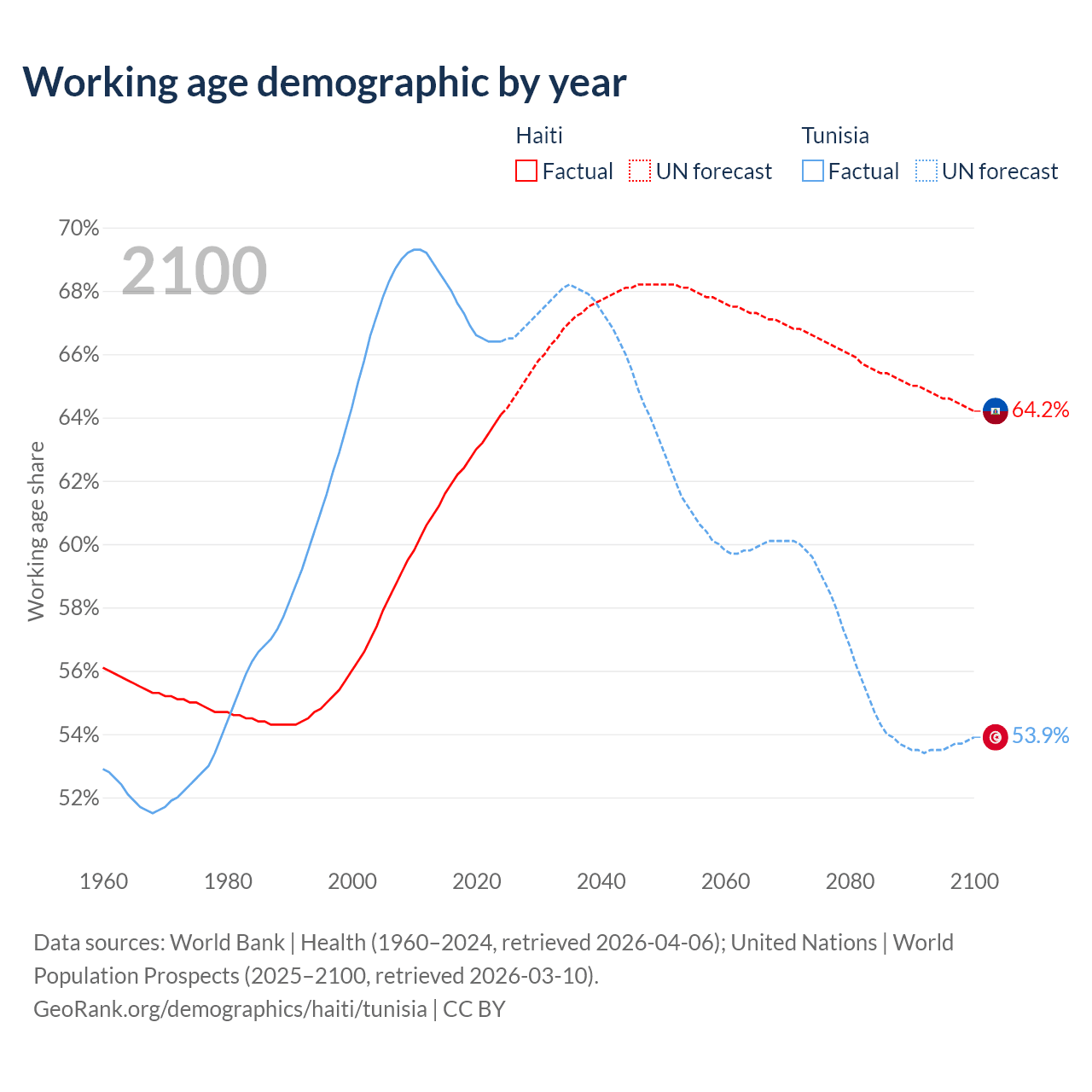 - Haiti has 7.74M working age adults (aged 15-64) vs 8.26M in Tunisia.