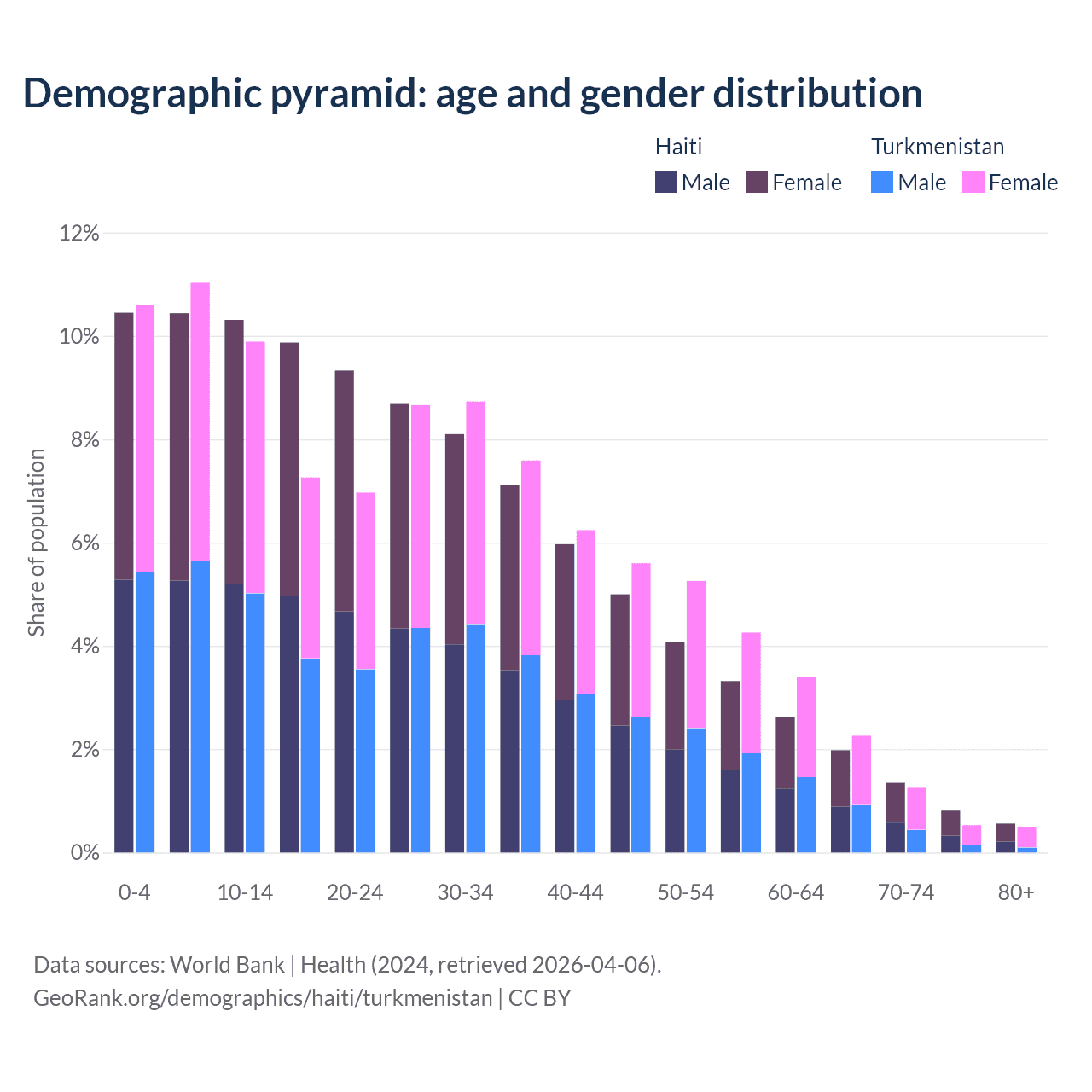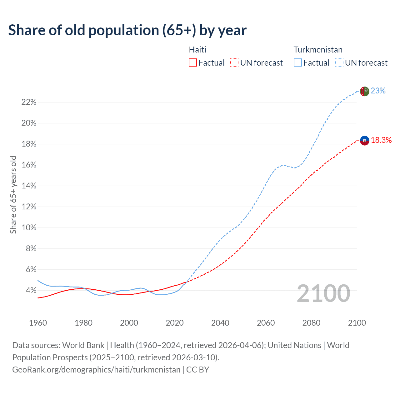 - The share of old-age demographic (65+) in Haiti is 4.71% vs 4.53% in Turkmenistan.
