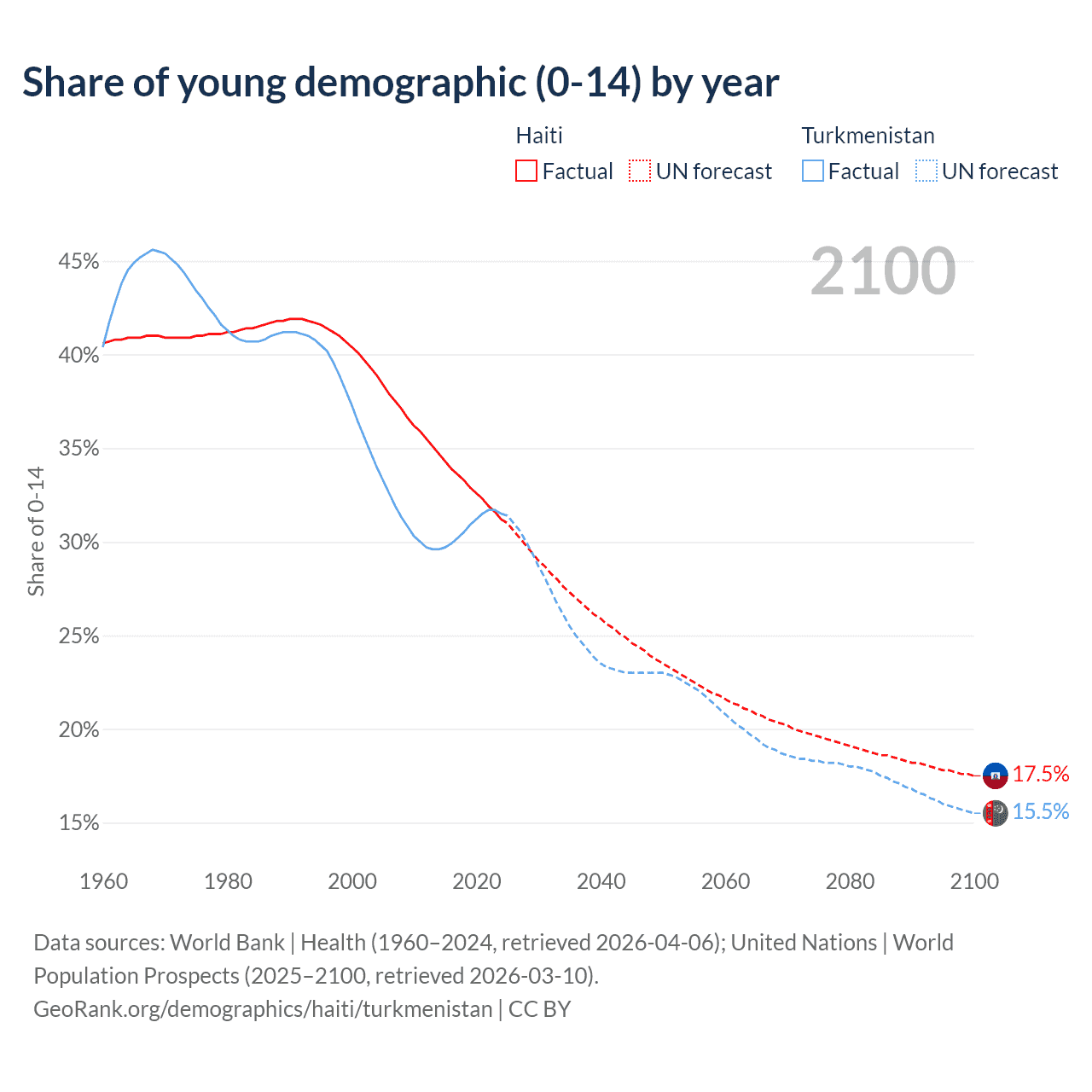 - The share of young demographic (0-15 years old) in Haiti is 31.2% vs 31.5% in Turkmenistan.