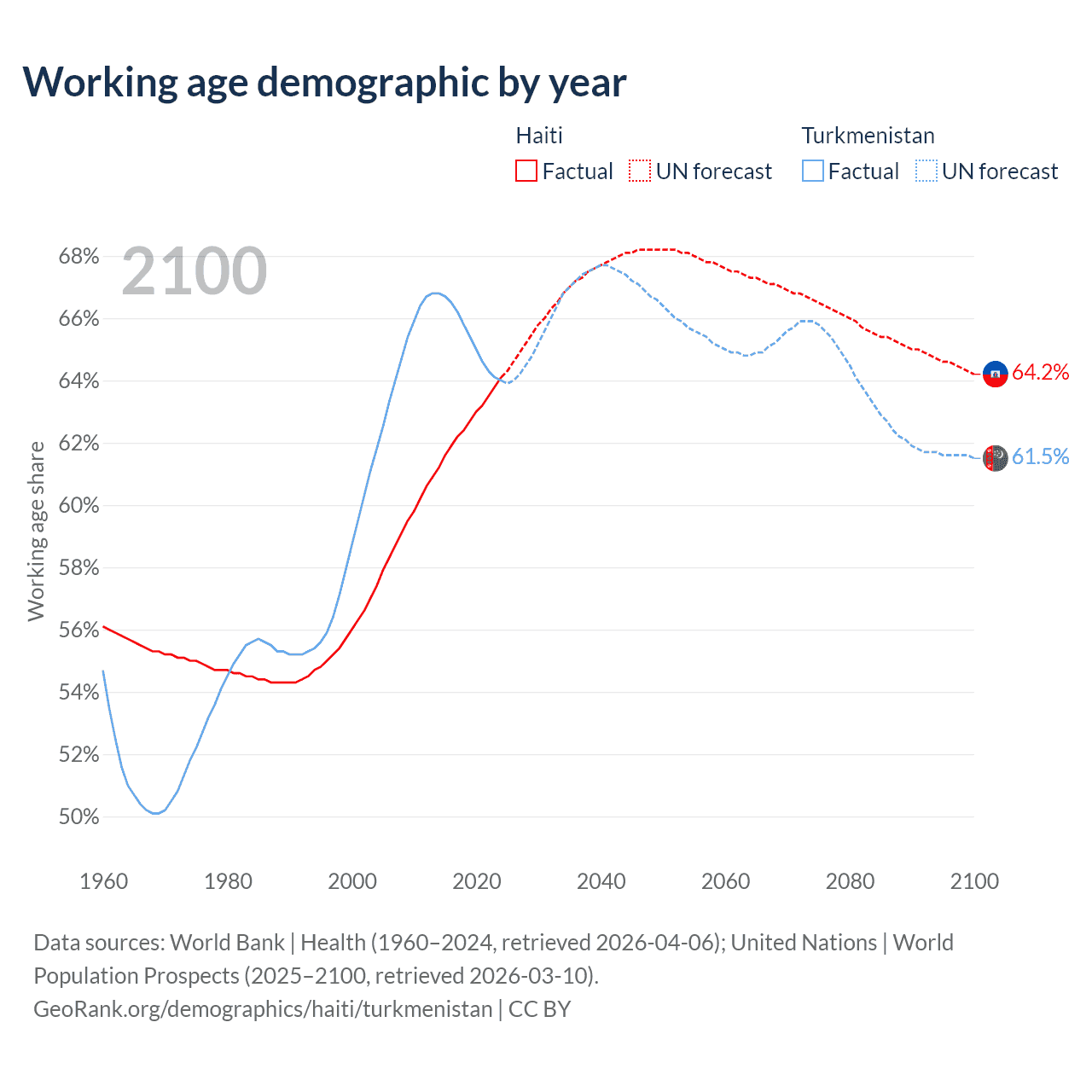 - Haiti has 7.74M working age adults (aged 15-64) vs 4.97M in Turkmenistan.