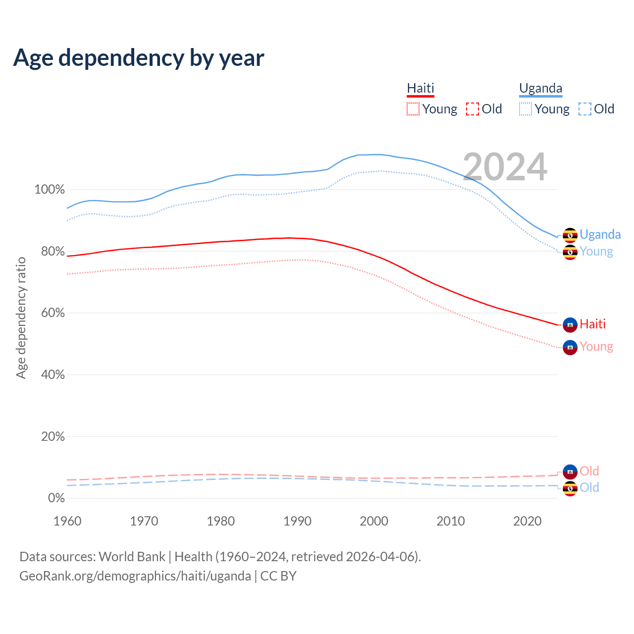 - The share of old-age demographic (65+) in Haiti is 4.71% vs 2.19% in Uganda.