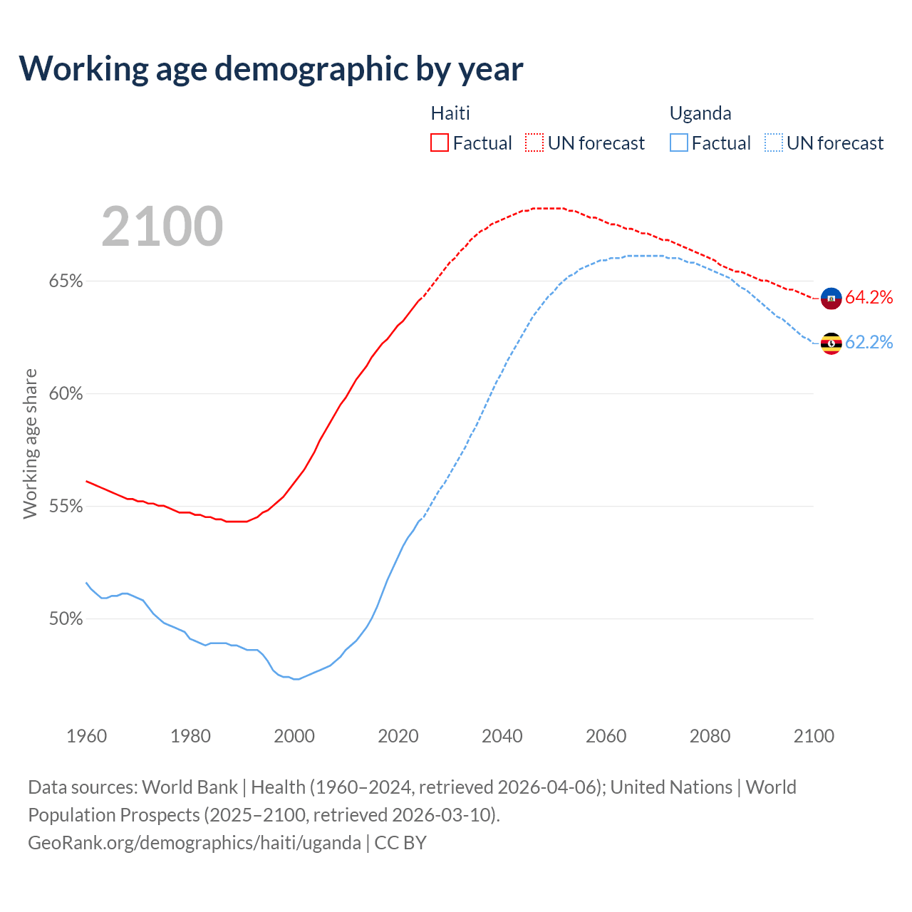 The share of older people aged 65 and over is 4.71% in Haiti and 2.19% in Uganda. Life expectancy in Haiti compared to Uganda .