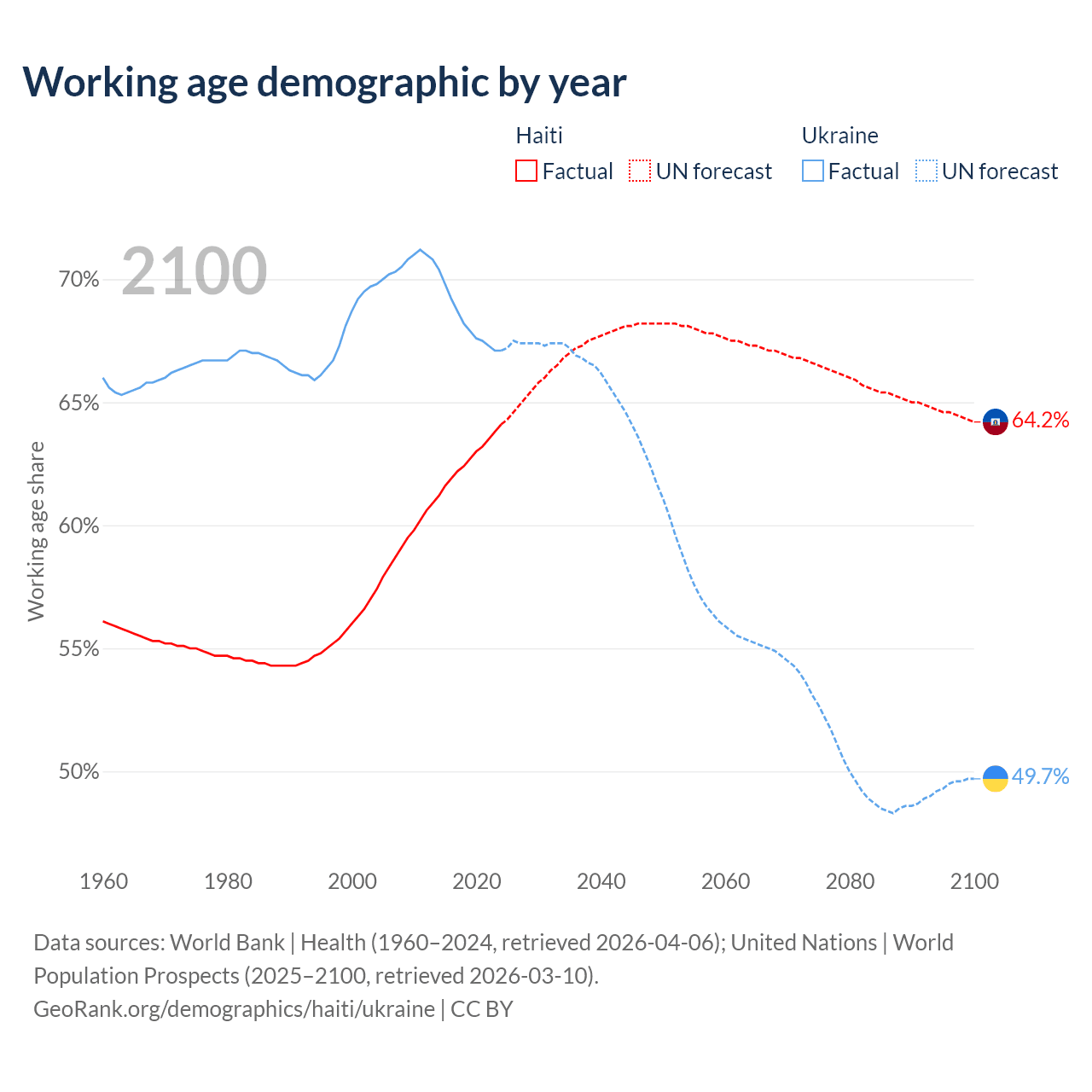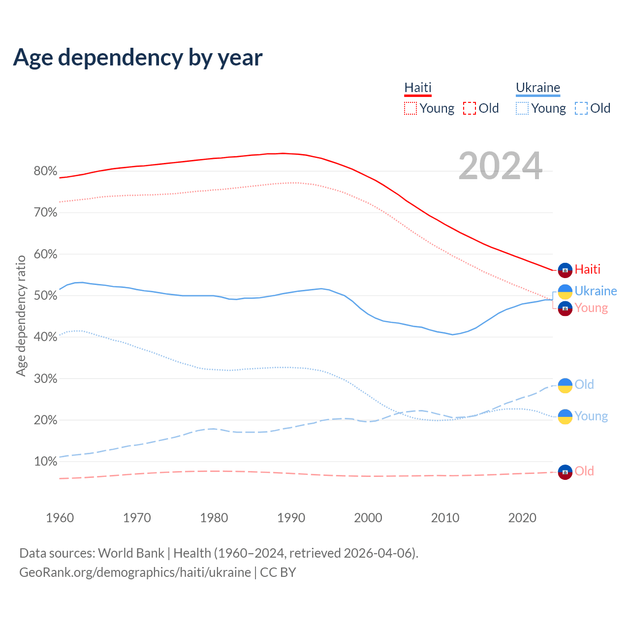 - The share of old-age demographic (65+) in Haiti is 4.71% vs 19% in Ukraine.