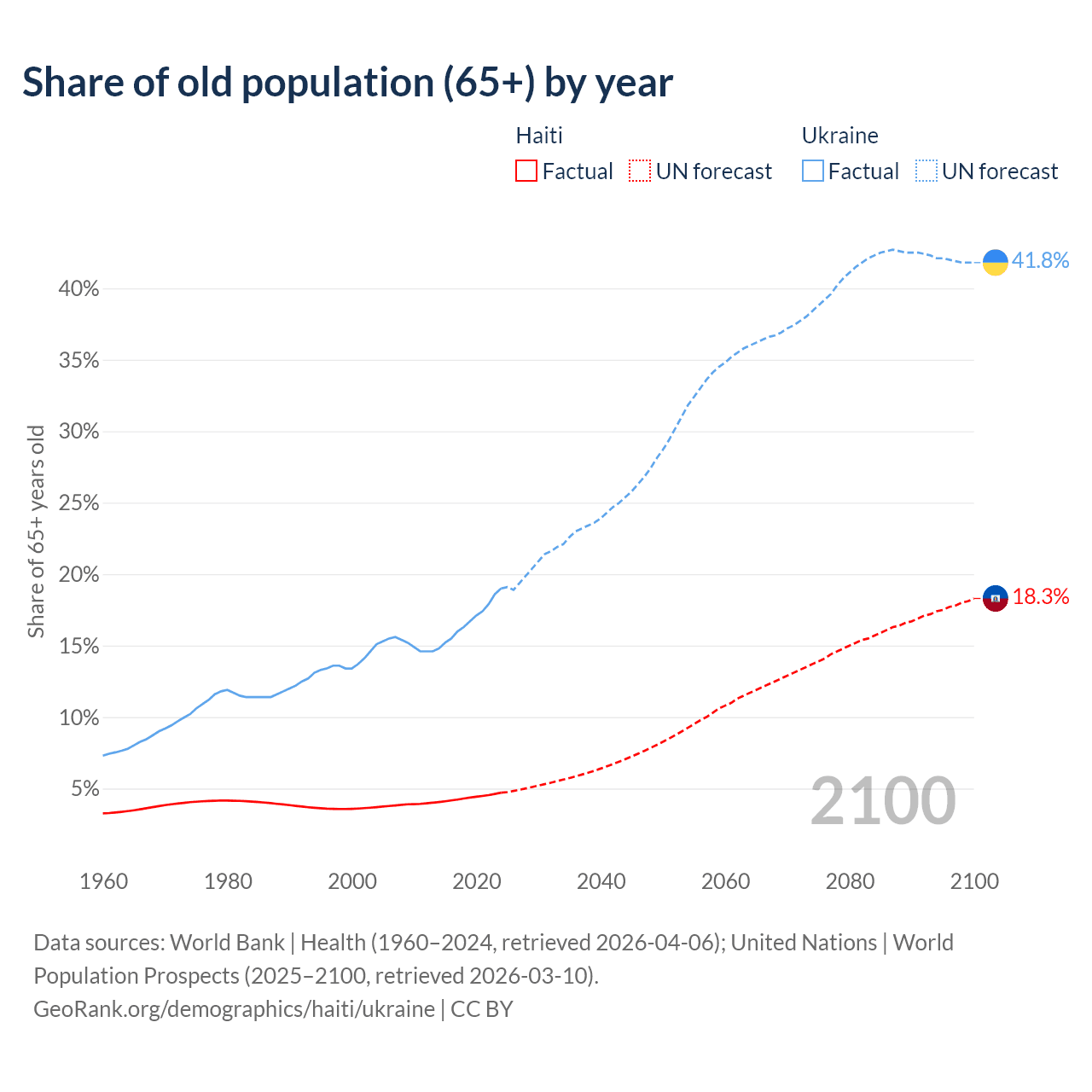 The share of older people aged 65 and over is 4.71% in Haiti and 19% in Ukraine. Life expectancy in Haiti compared to Ukraine .