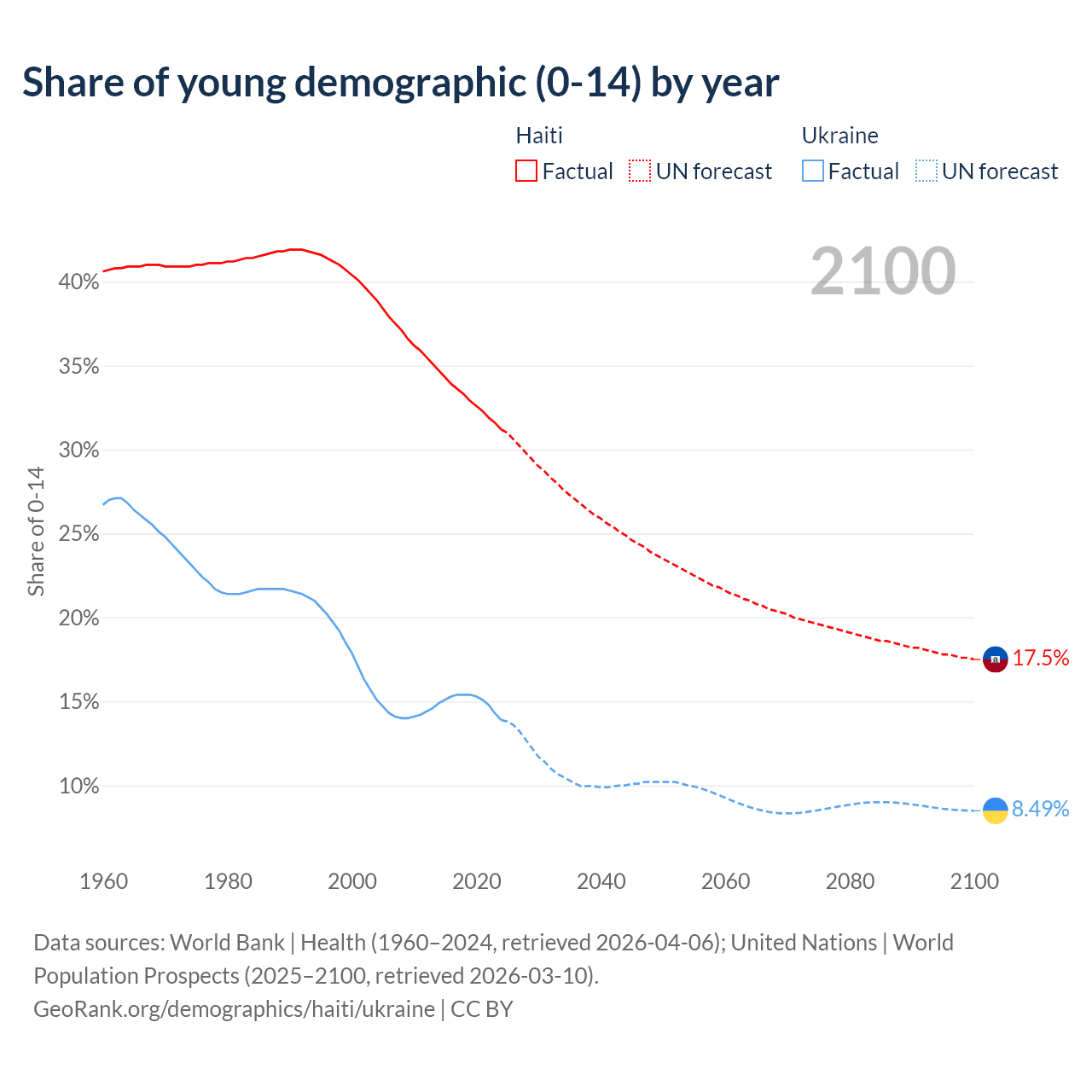 - The share of young demographic (0-15 years old) in Haiti is 31.2% vs 13.9% in Ukraine.
