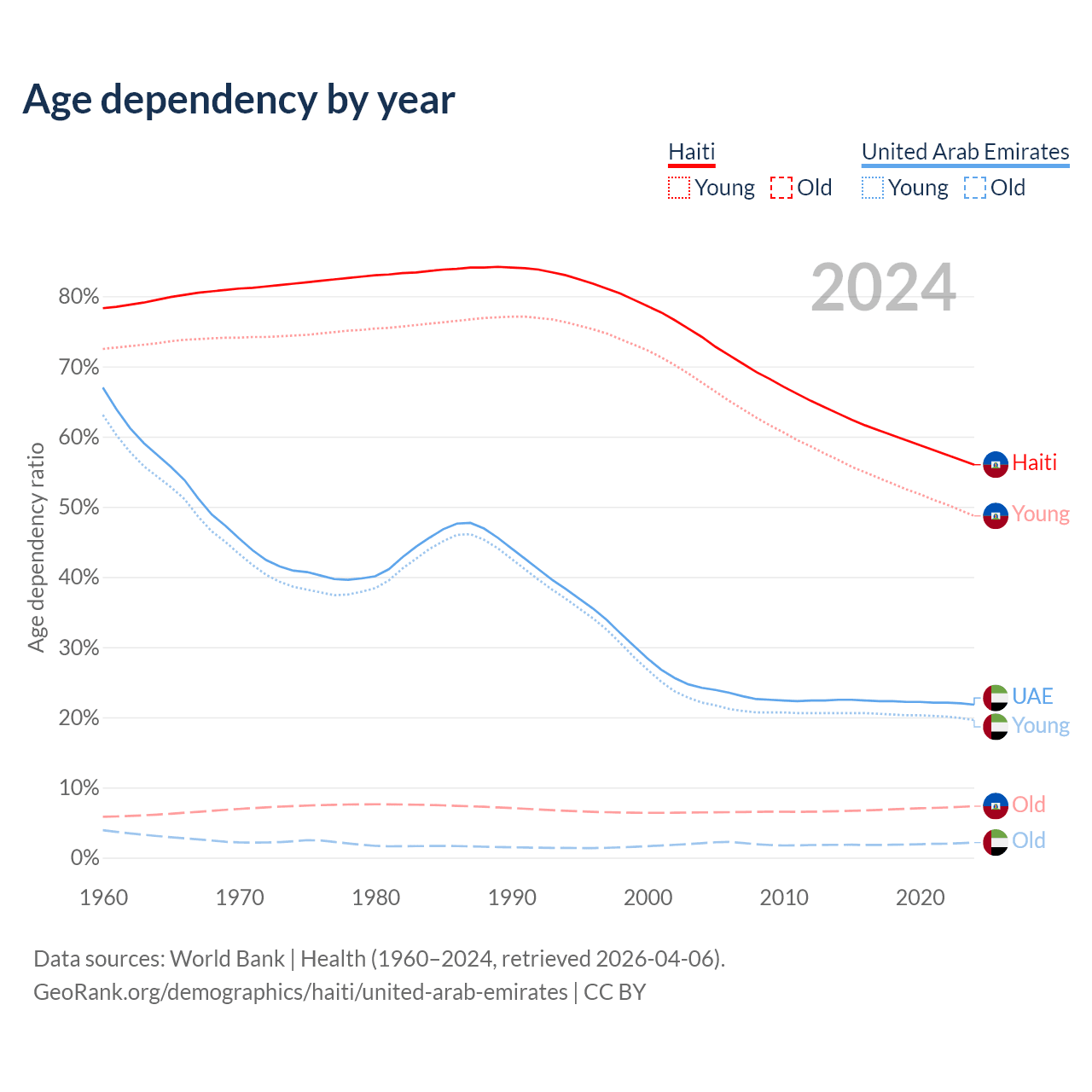 - The share of old-age demographic (65+) in Haiti is 4.71% vs 1.77% in the United Arab Emirates.