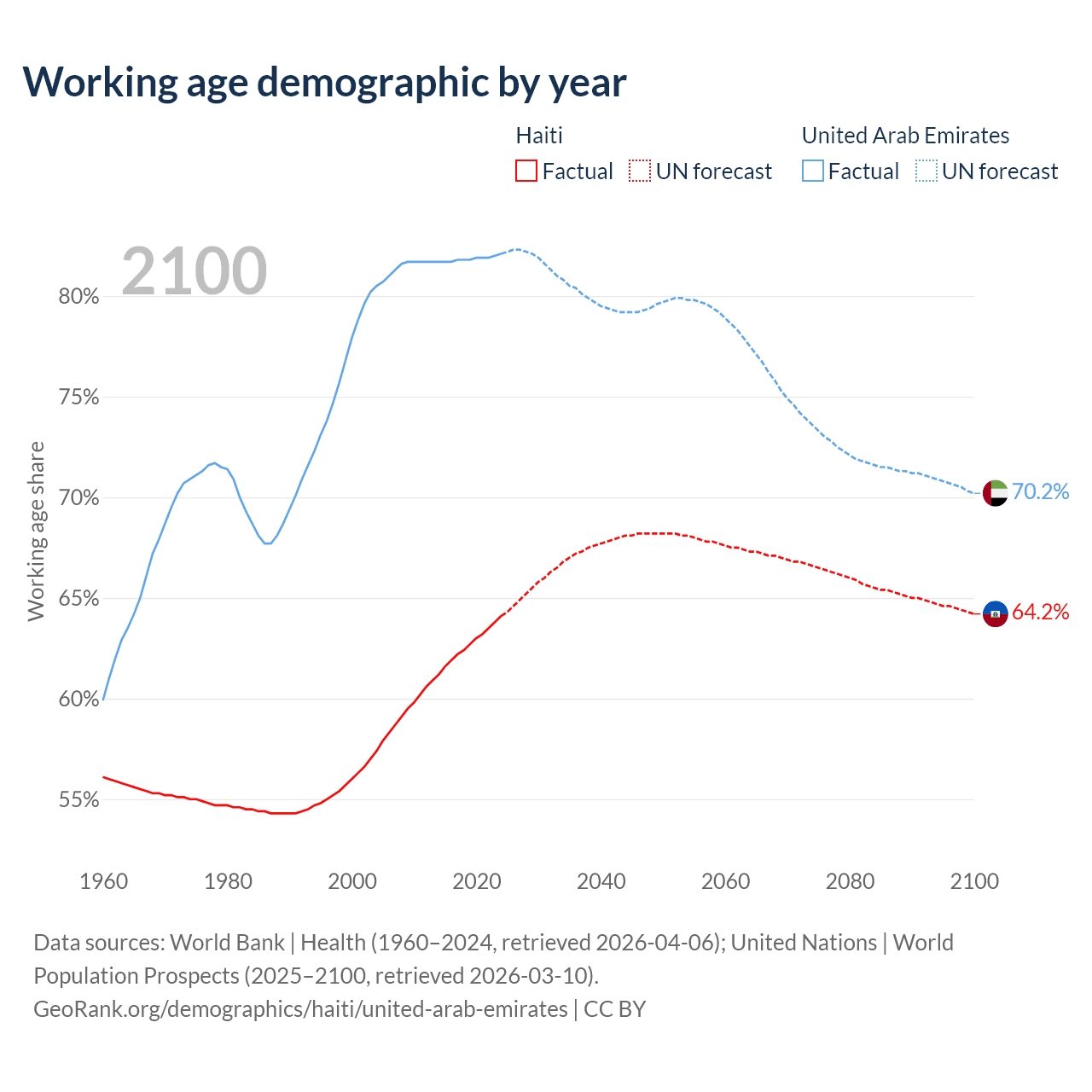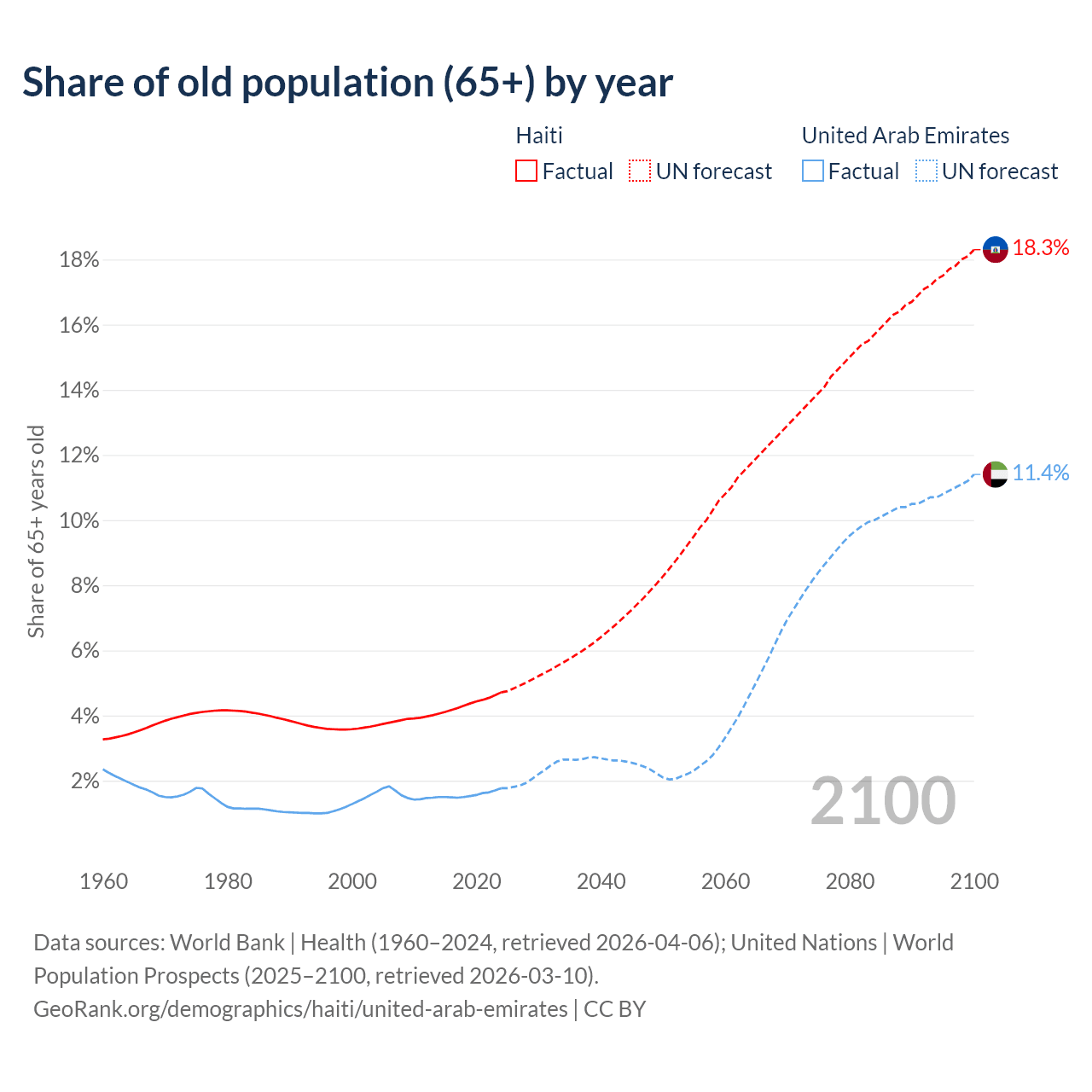 The share of older people aged 65 and over is 4.71% in Haiti and 1.77% in the United Arab Emirates. Life expectancy in Haiti compared to the United Arab Emirates .