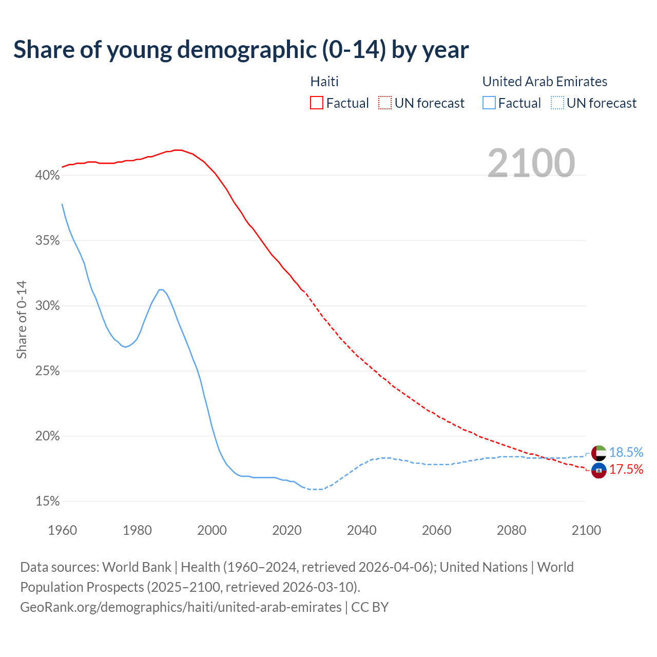 - The share of young demographic (0-15 years old) in Haiti is 31.2% vs 16.1% in the United Arab Emirates.