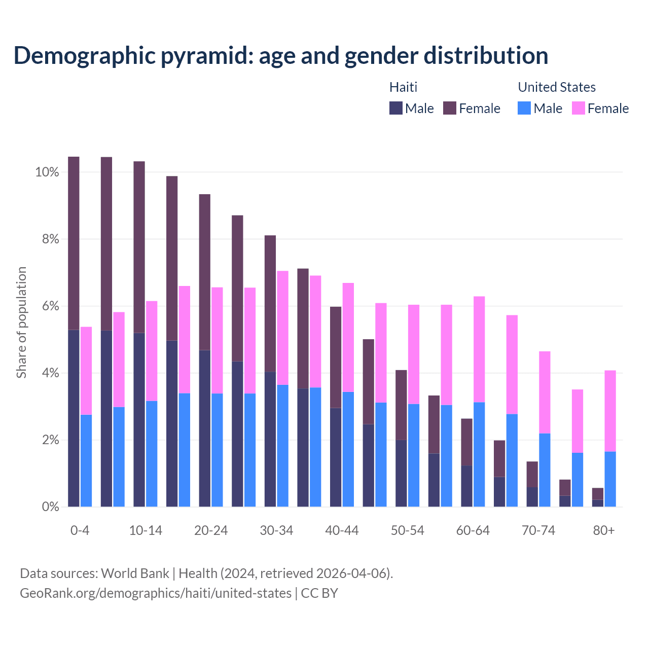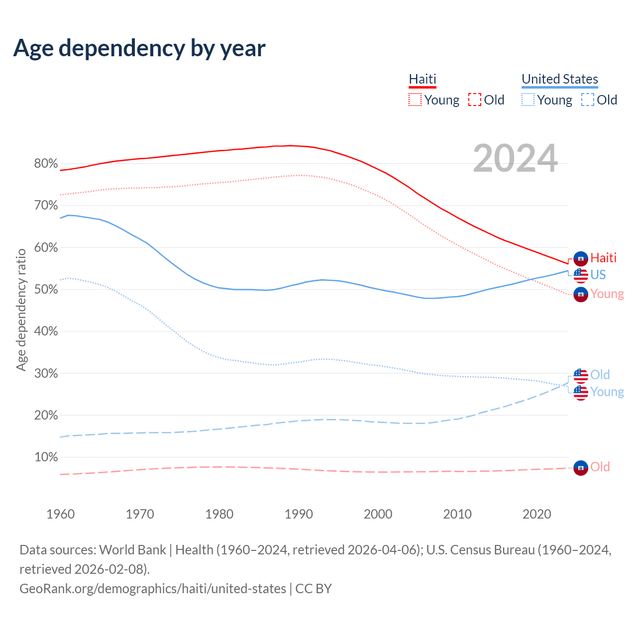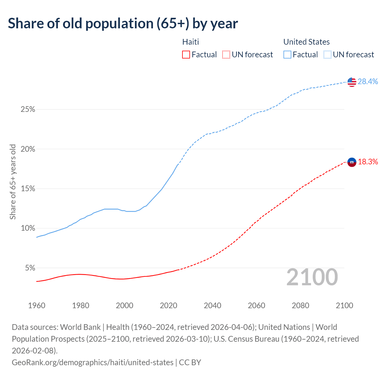 - The share of old-age demographic (65+) in Haiti is 4.71% vs 17.9% in the United States.