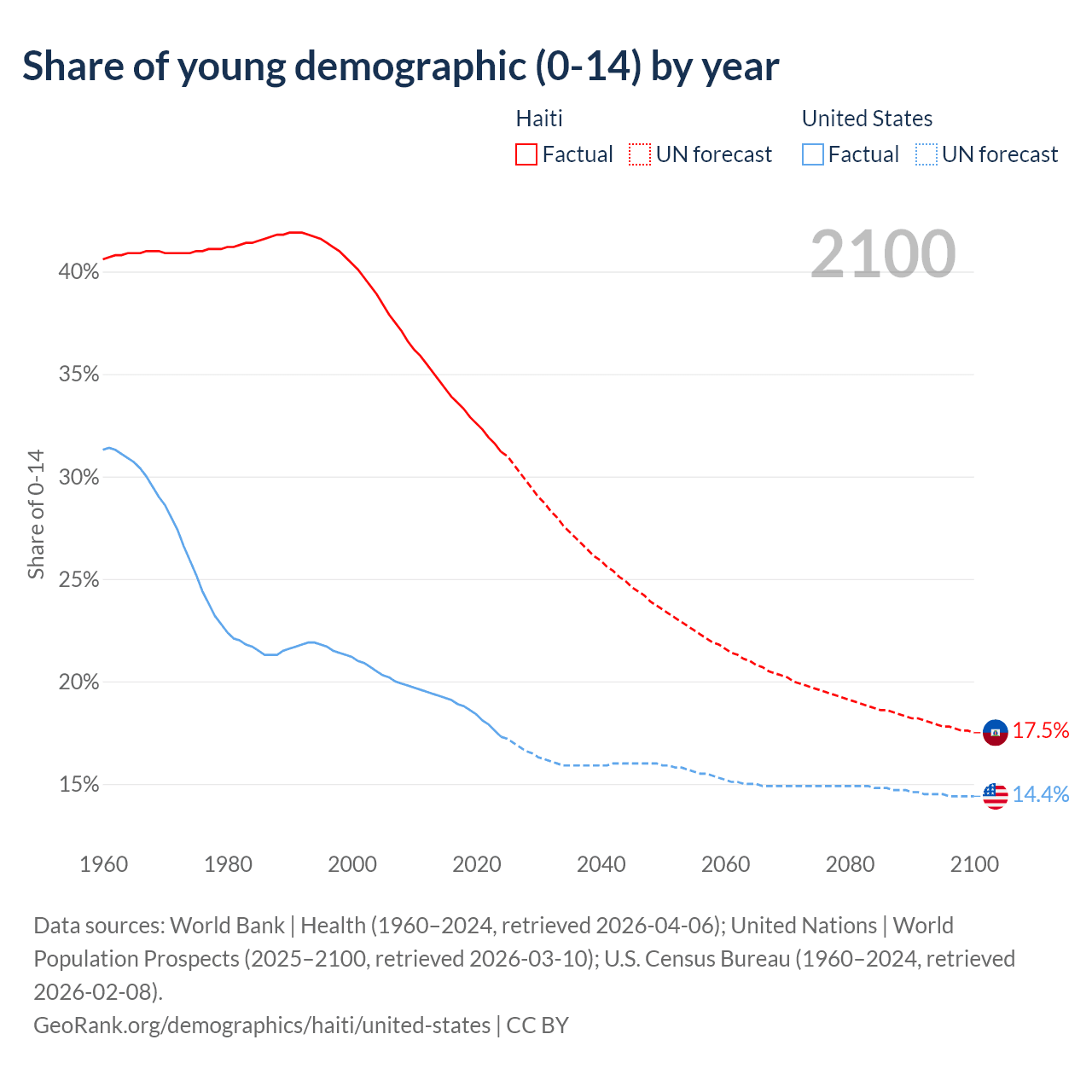 - The share of young demographic (0-15 years old) in Haiti is 31.2% vs 17.3% in the United States.