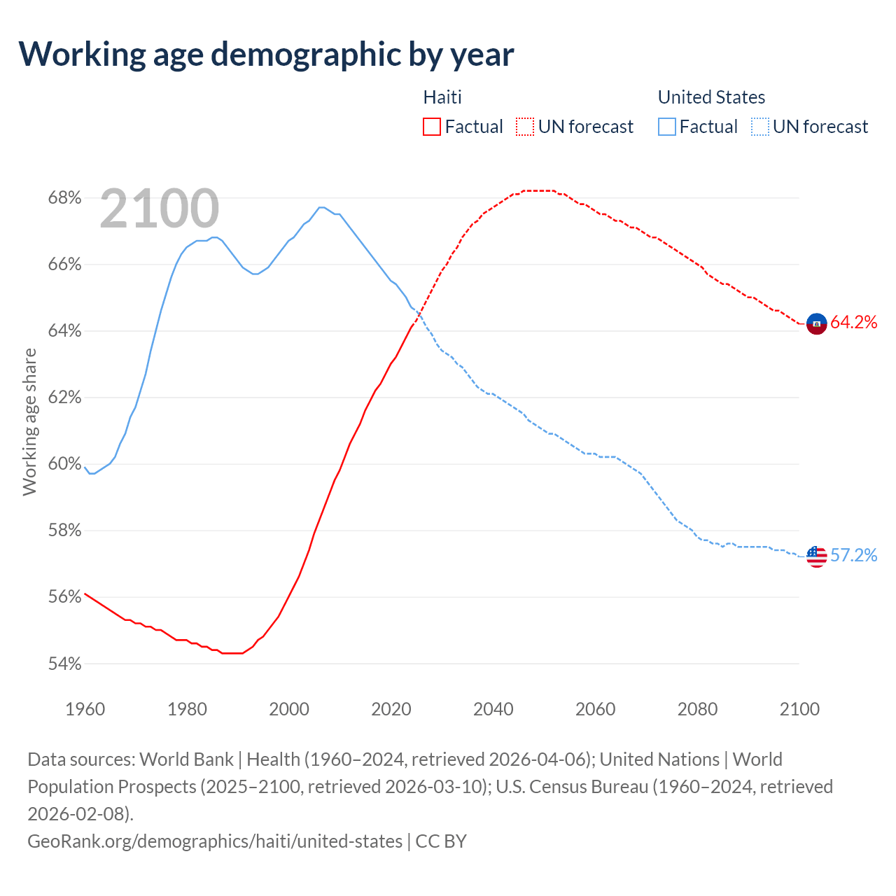 - Haiti has 7.74M working age adults (aged 15-64) vs 223M in the United States.