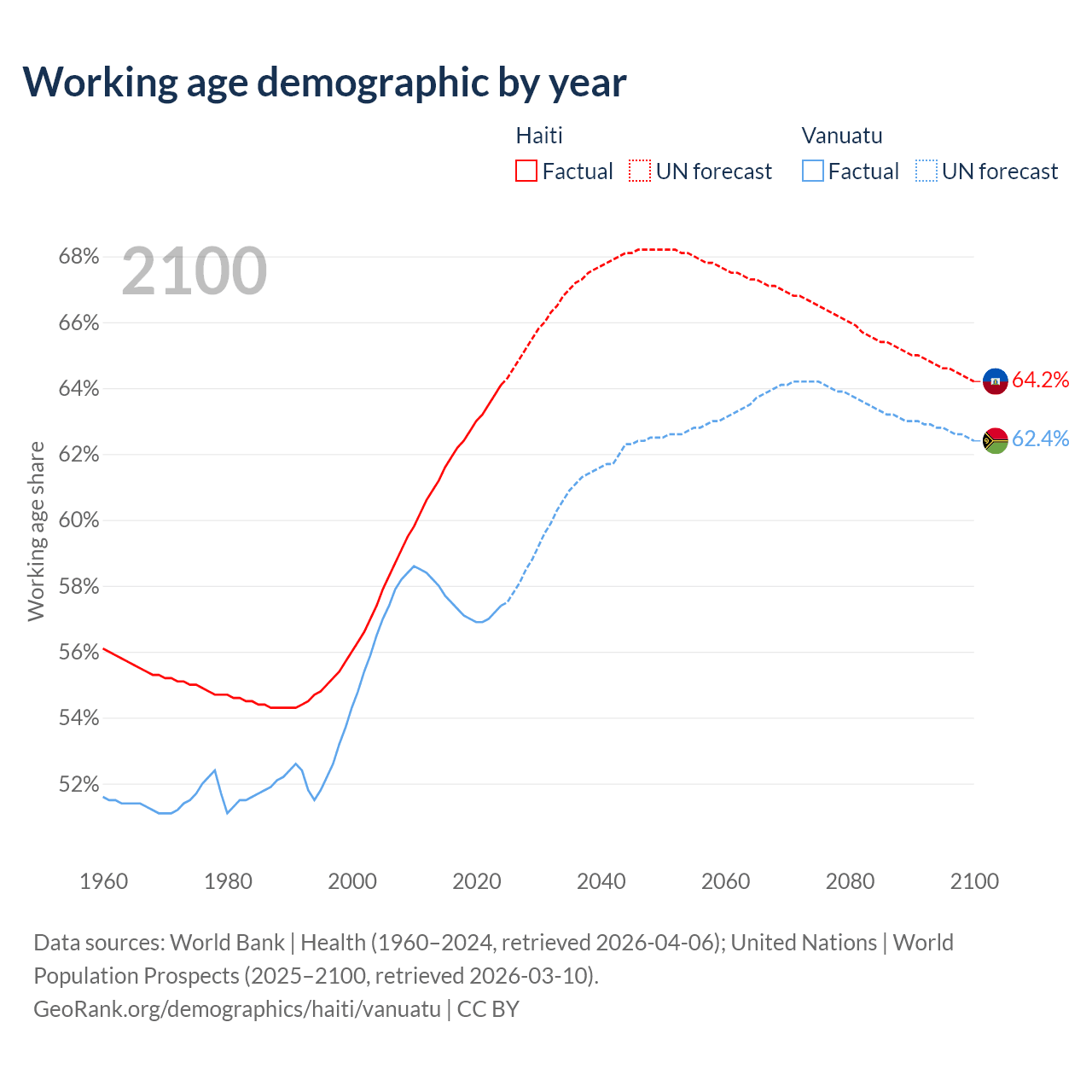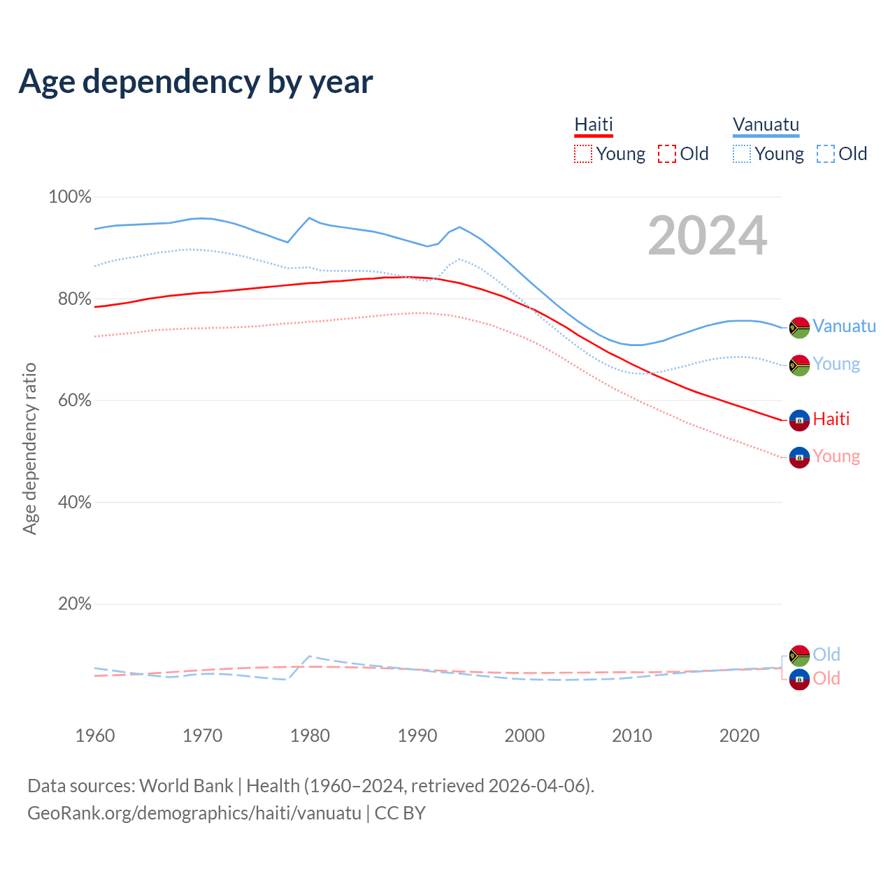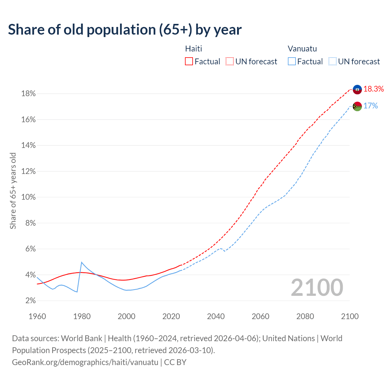 The share of older people aged 65 and over is 4.71% in Haiti and 4.3% in Vanuatu. Life expectancy in Haiti compared to Vanuatu .