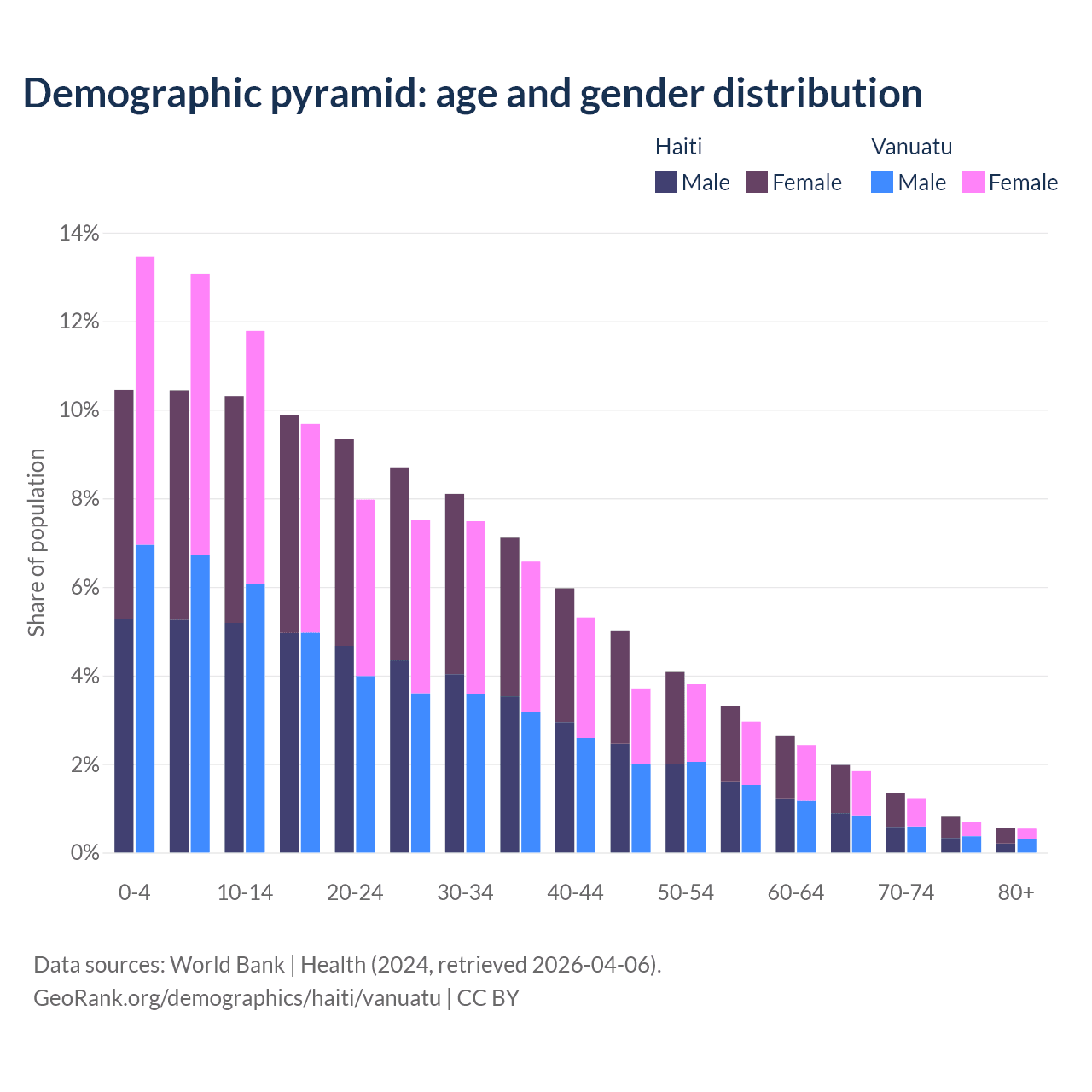 - The share of young demographic (0-15 years old) in Haiti is 31.2% vs 38.3% in Vanuatu.