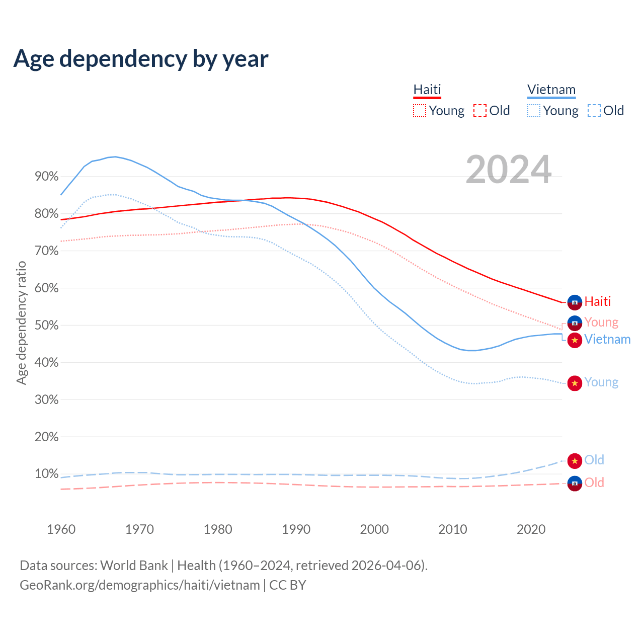 Data sources: World Bank | Health (1960–2024, retrieved 2026-04-06); U.S. Census Bureau (1960–2024, retrieved 2026-02-08).