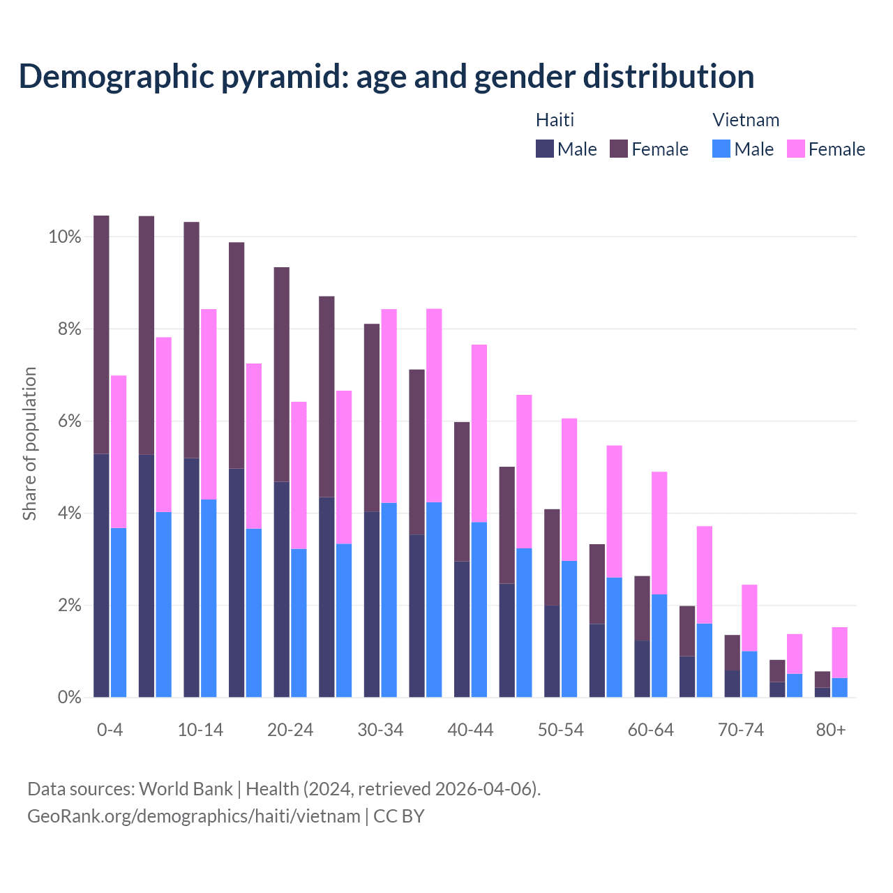 - Haiti is ranked 135/196 by median age (oldest to youngest) vs 84/196 for Vietnam.