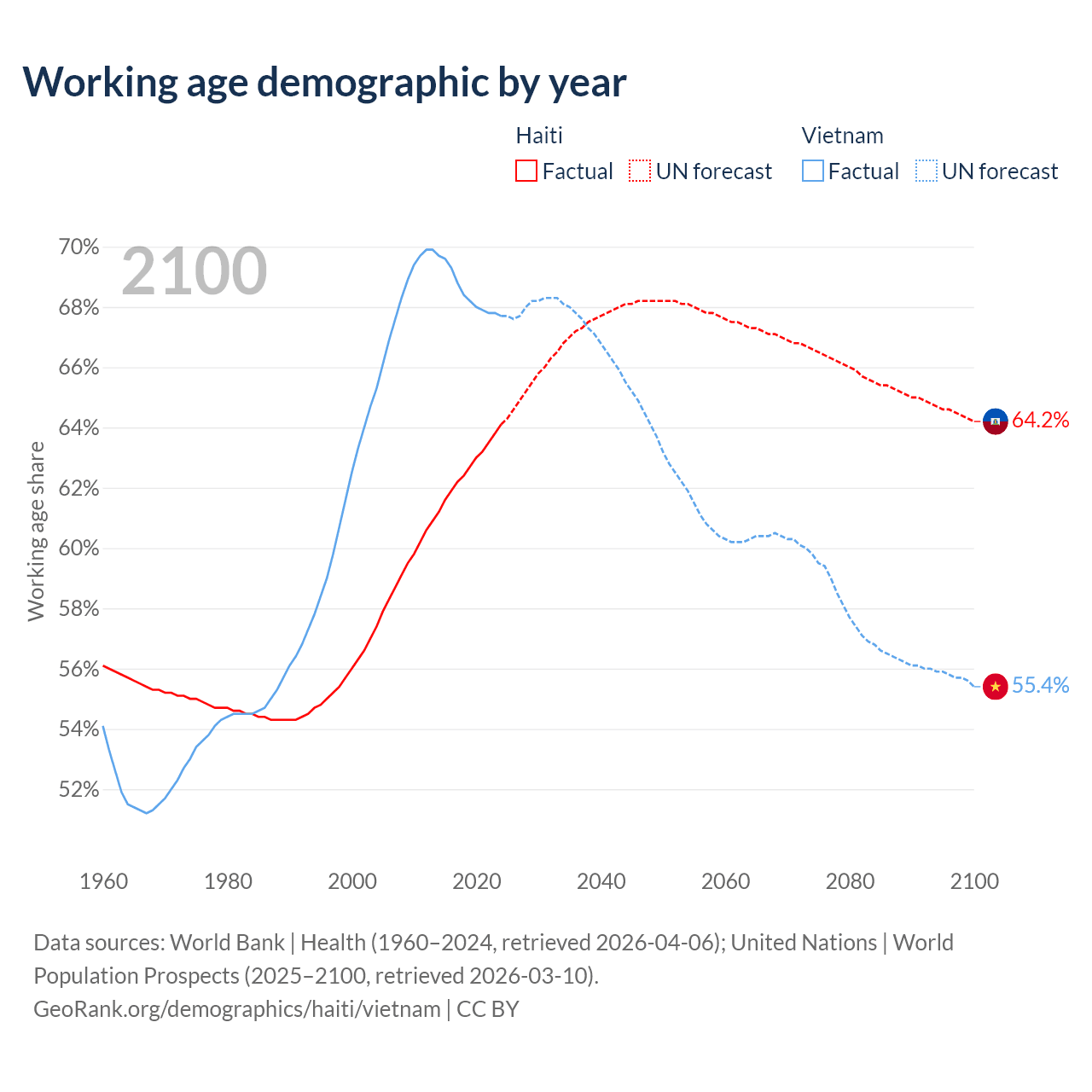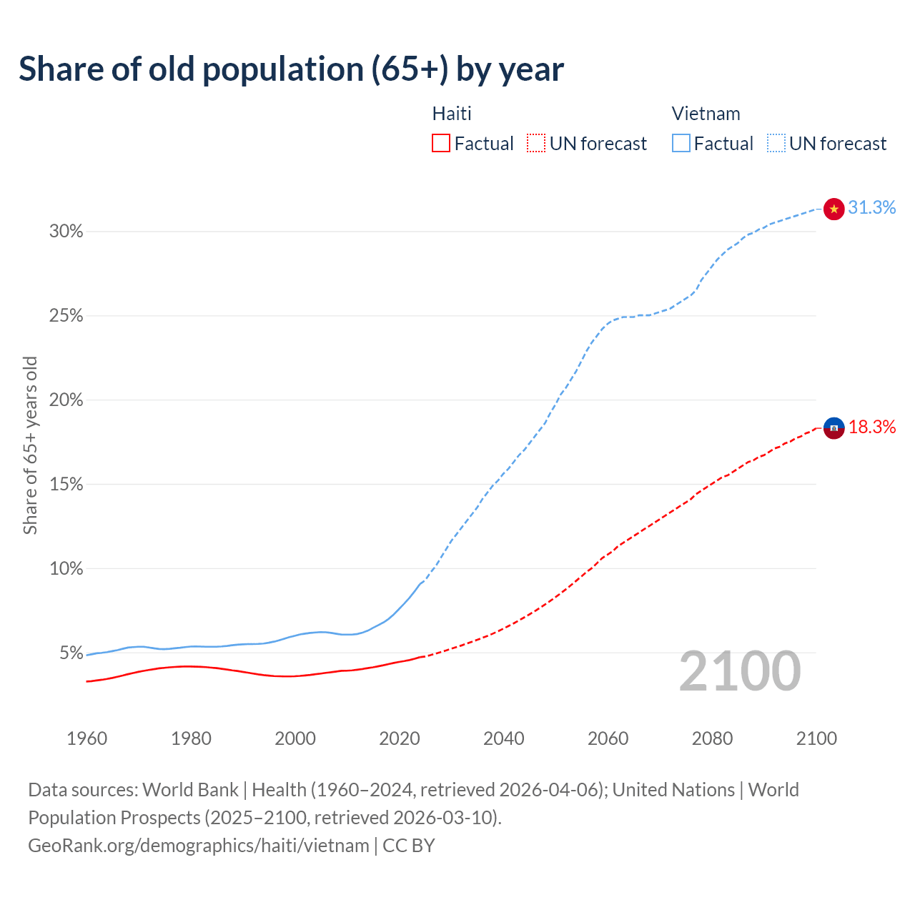 The share of older people aged 65 and over is 4.71% in Haiti and 9.05% in Vietnam. Life expectancy in Haiti compared to Vietnam .