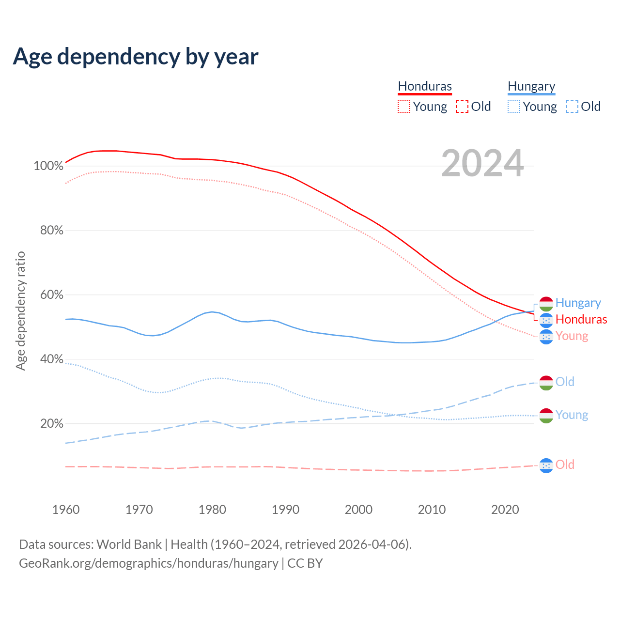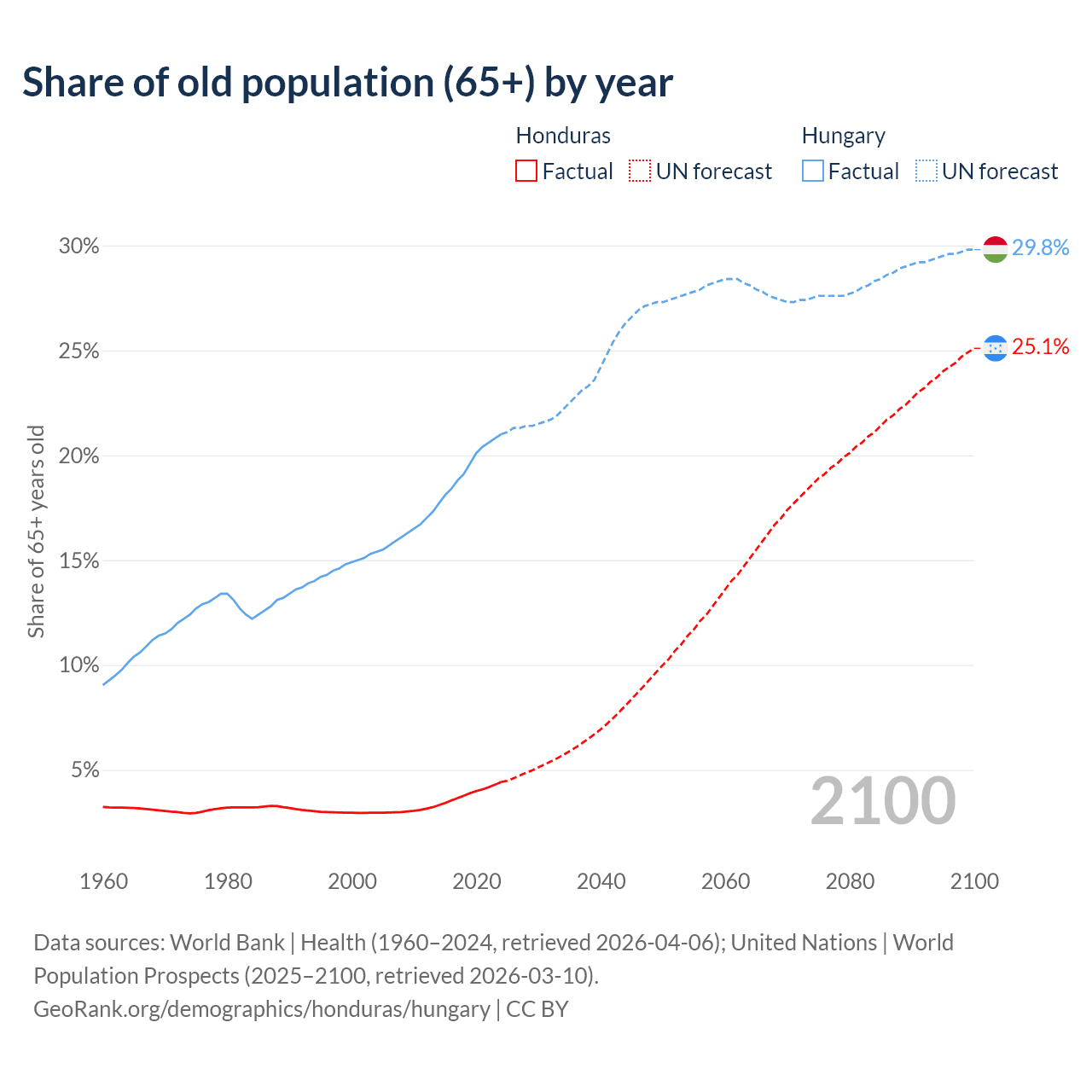 The share of older people aged 65 and over is 4.42% in Honduras and 21% in Hungary. Life expectancy in Honduras compared to Hungary .