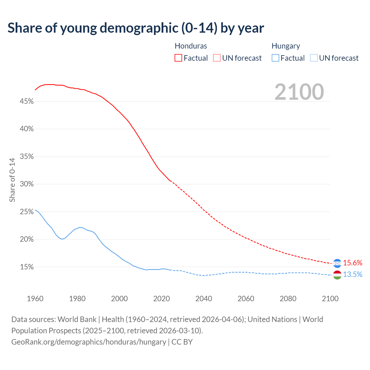 - The share of young demographic (0-15 years old) in Honduras is 30.6% vs 14.4% in Hungary.