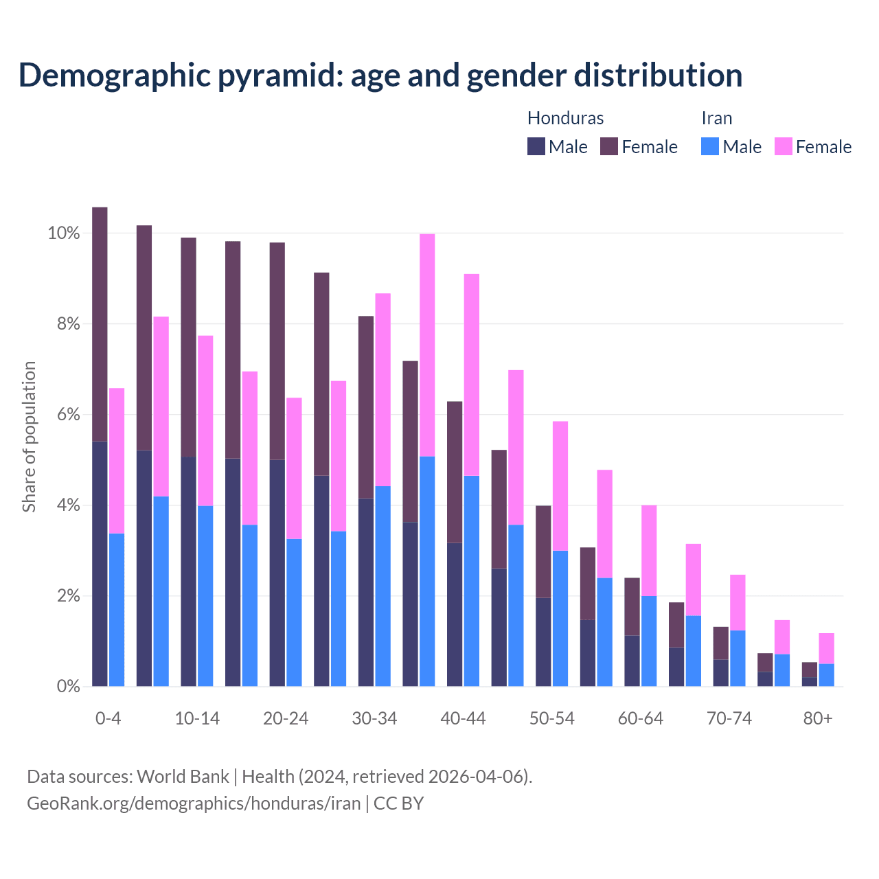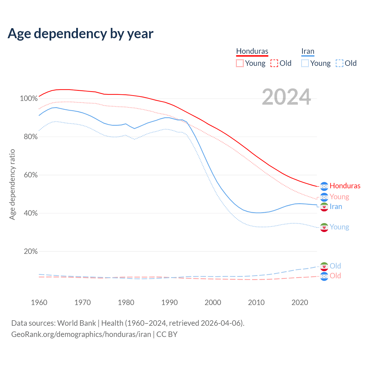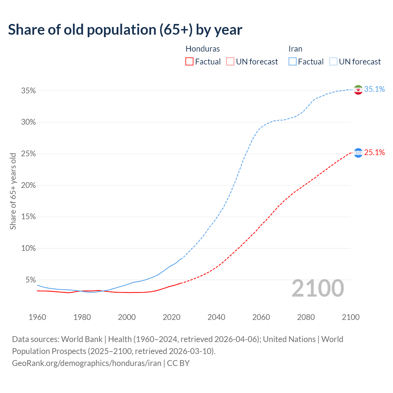 - The share of old-age demographic (65+) in Honduras is 4.42% vs 8.24% in Iran.