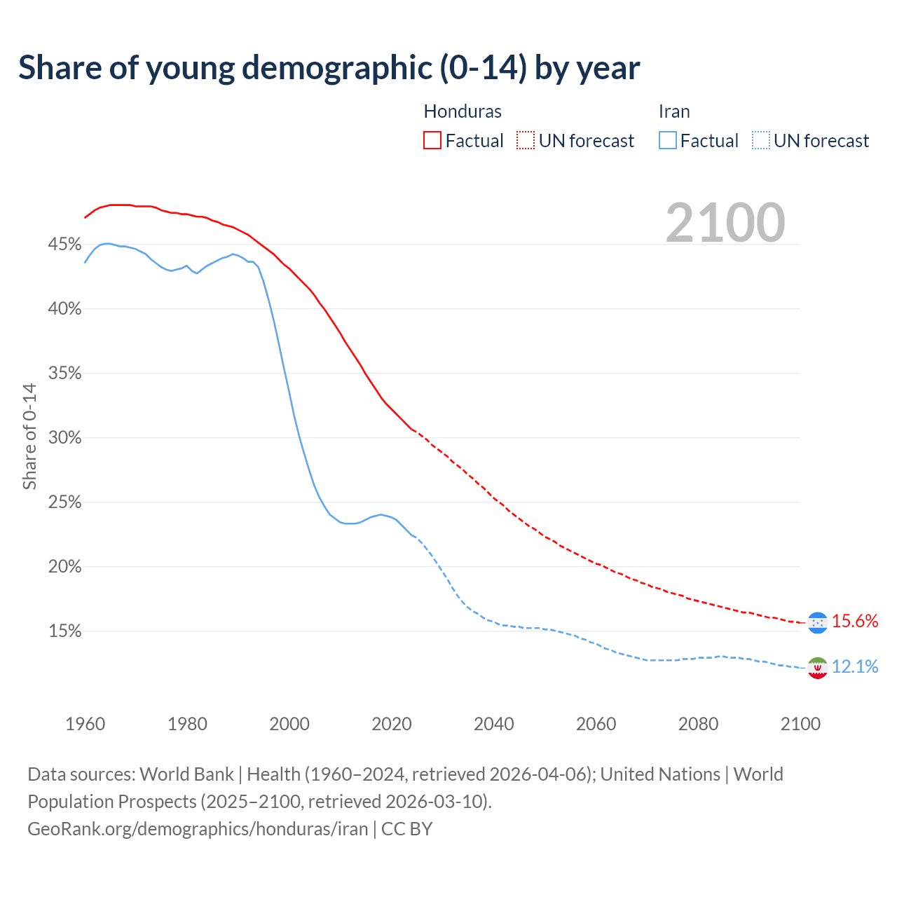 - The share of young demographic (0-15 years old) in Honduras is 30.6% vs 22.4% in Iran.